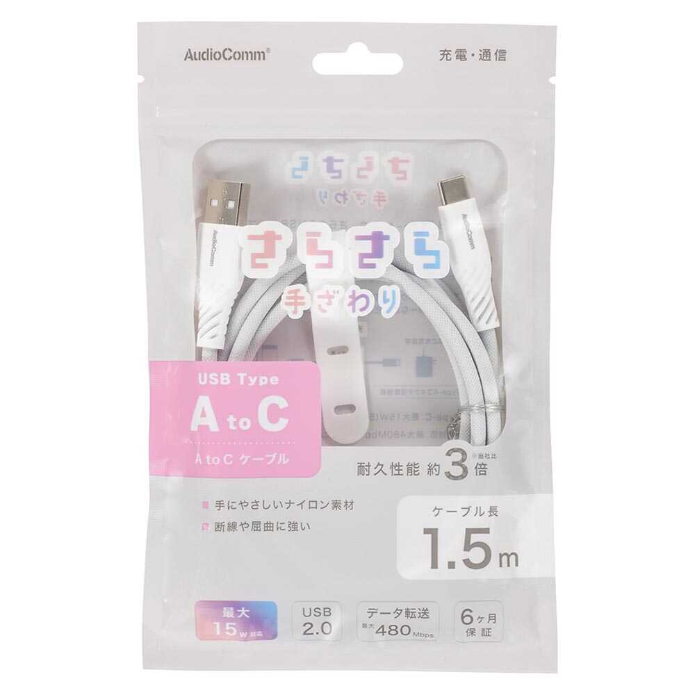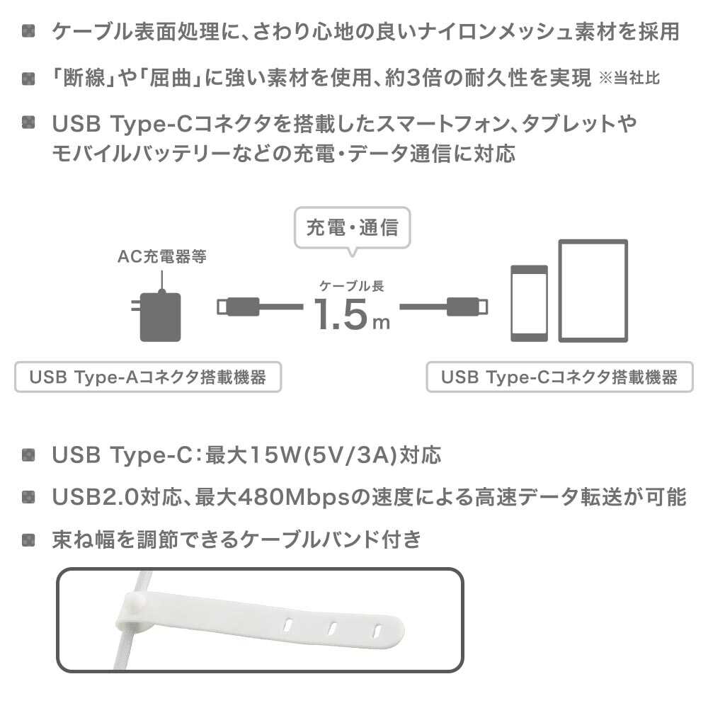 ケーブル表面処理、さわり心地の良い、ナイロンメッシュ素材、断線、屈曲に強い素材を使用、当社従来品、約3倍、耐久性を実現、USB、Type-C、最大15W、5V、3A対応、USB2.0対応、最大480Mbps、速度による高速データ転送が可能、束ね幅、調節できる、ケーブルバンド付き、6ヶ月間保証、カラー、グレー