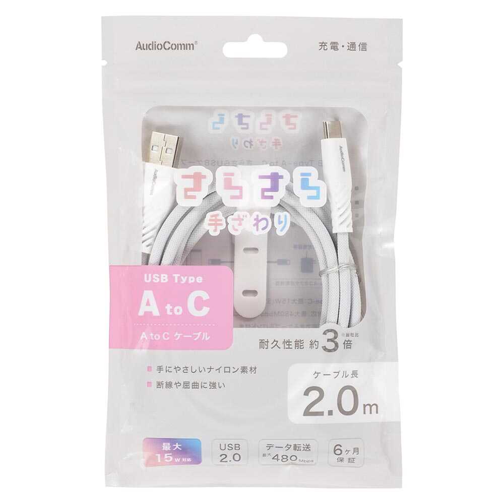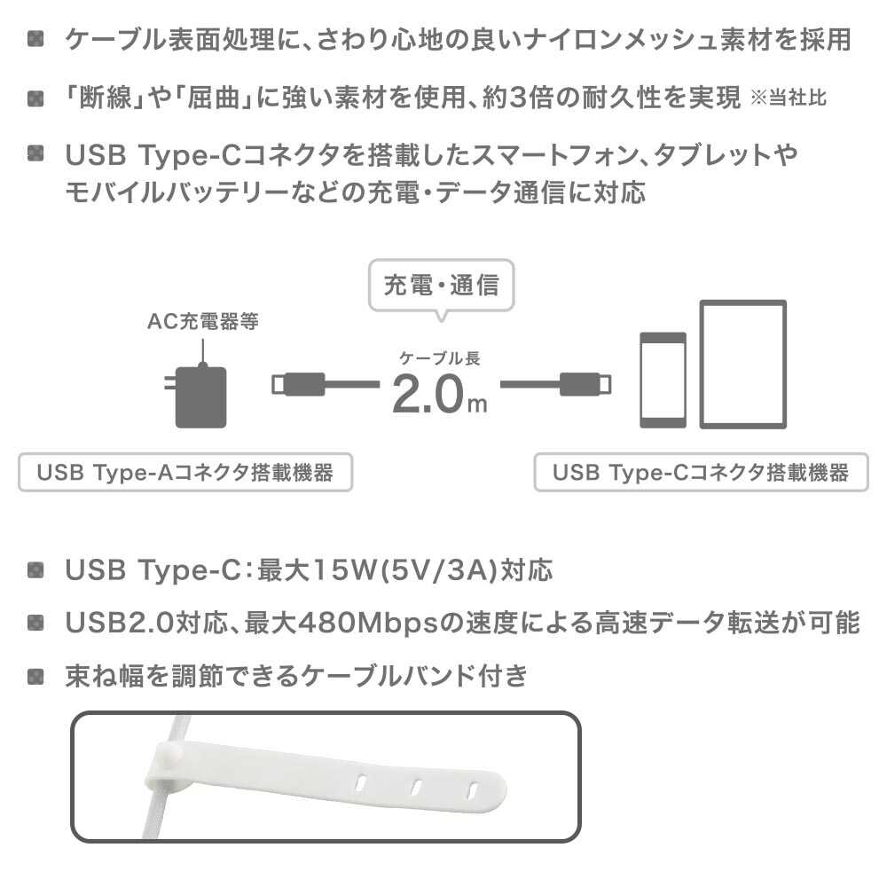ケーブル表面処理、さわり心地の良い、ナイロンメッシュ素材を採用、断線、屈曲に強い素材を使用、当社従来品、約3倍、耐久性を実現、USB、Type-C、最大15W、5V、3A対応、USB2.0対応、最大480Mbps、速度による高速データ転送が可能、束ね幅を調節、ケーブルバンド付き、6ヶ月間保証、カラー、グレー