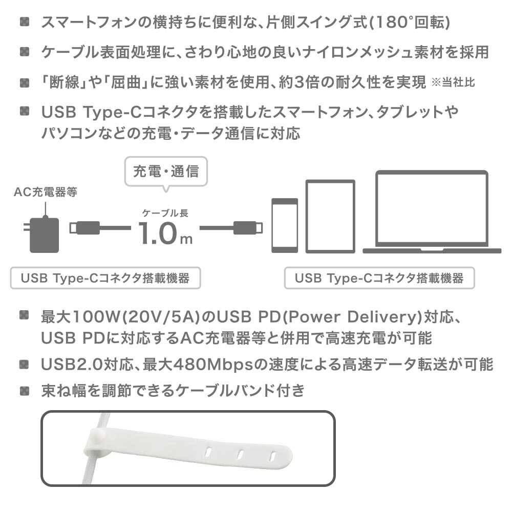 ● スマートフォンの横持ちに便利な、片側スイング式(180°回転) ● ケーブル表面処理に、さわり心地の良いナイロンメッシュ素材を採用 ● 「断線」や「屈曲」に強い素材を使用、当社従来品より約3倍の耐久性を実現 ● 最大100W(20V/5A)のUSB PD(Power Delivery)対応、USB PDに対応するAC充電器等と併用で高速充電が可能 ● USB2.0対応、最大480Mbpsの速度による高速データ転送が可能 ● 束ね幅を調節できるケーブルバンド付き ● 6ヶ月間保証 ● カラーはグレー ●コネクタ形状:USB Type-C - USB Type-C(充電・通信用)※片側スイング式