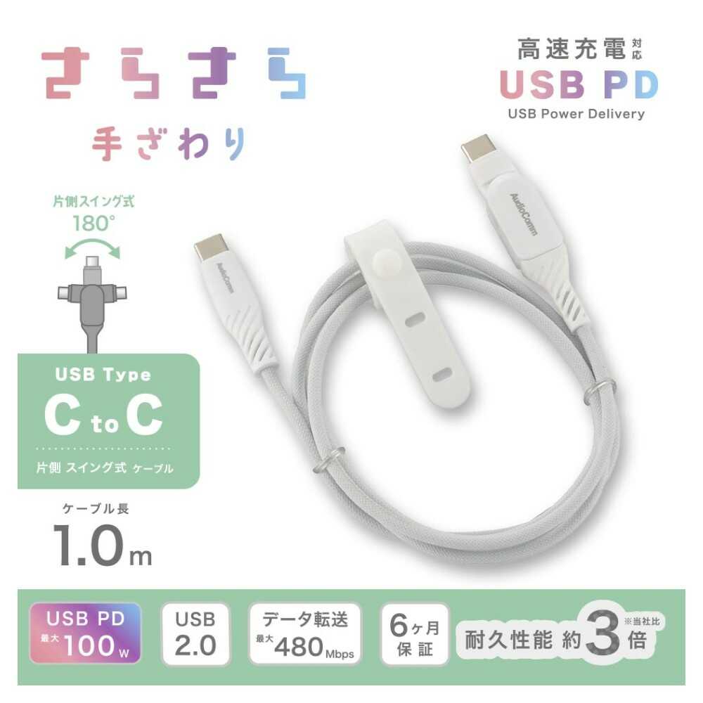 スマートフォン、横持ちに便利、片側スイング式、180°回転、ケーブル表面処理、さわり心地の良いナイロンメッシュ素材を採用、断線、屈曲に強い素材を使用、当社従来品より約3倍の耐久性を実現、最大100W、20V、5A、USB、PD、PowerDelivery対応、AC充電器等と併用で高速充電が可能、USB2.0対応、最大480Mbps、高速データ転送が可能、束ね幅を調節できる、ケーブルバンド付き、6ヶ月間保証、カラー、グレー