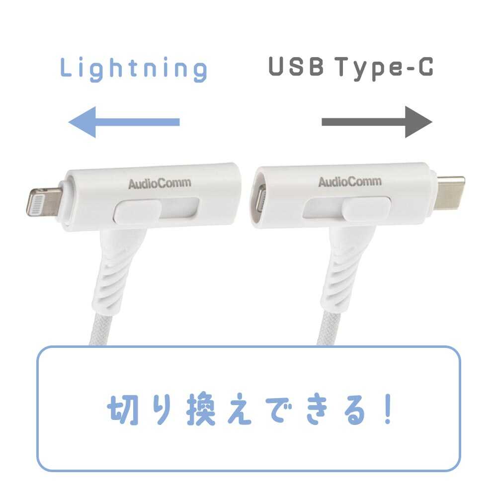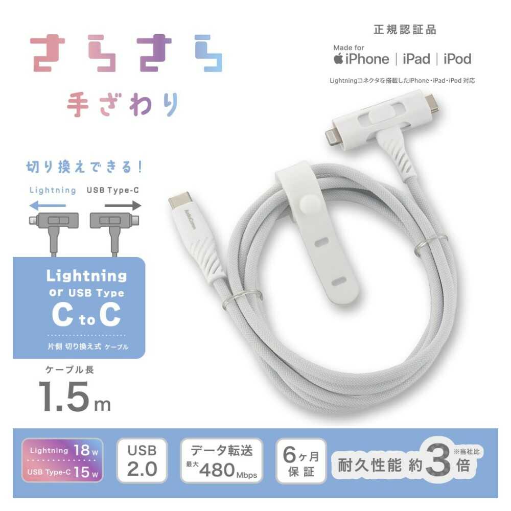 片側、Lightning、USB、Type-C、切り換えることができる、ケーブル表面処理、さわり心地の良いナイロンメッシュ素材を採用、断線、屈曲に強い素材を使用、当社従来品より約3倍の耐久性を実現、Lightningは18W高速充電対応、USBType-Cは15W、5V、3A、USB2.0対応、最大480Mbps、高速データ転送が可能、正規認定品、束ね幅を調節できる、ケーブルバンド付き、6ヶ月間保証、カラー、グレー