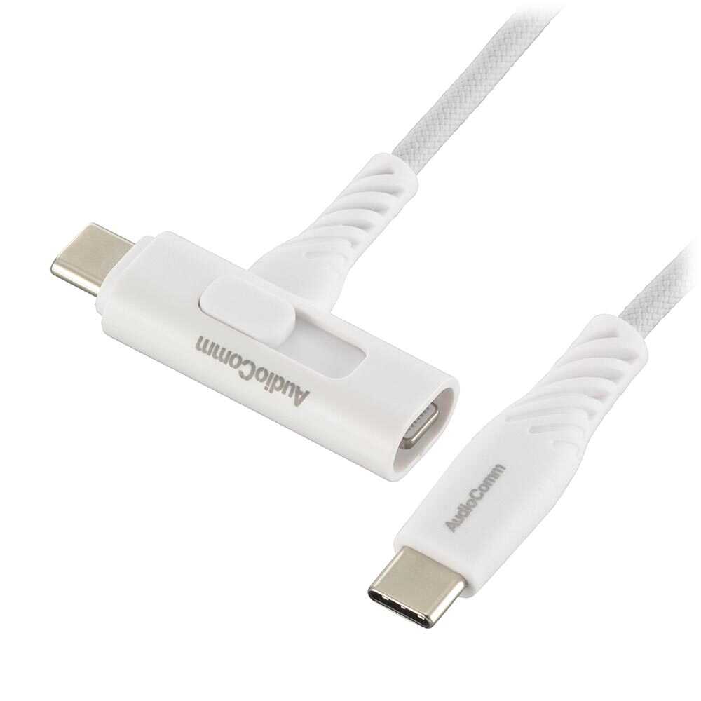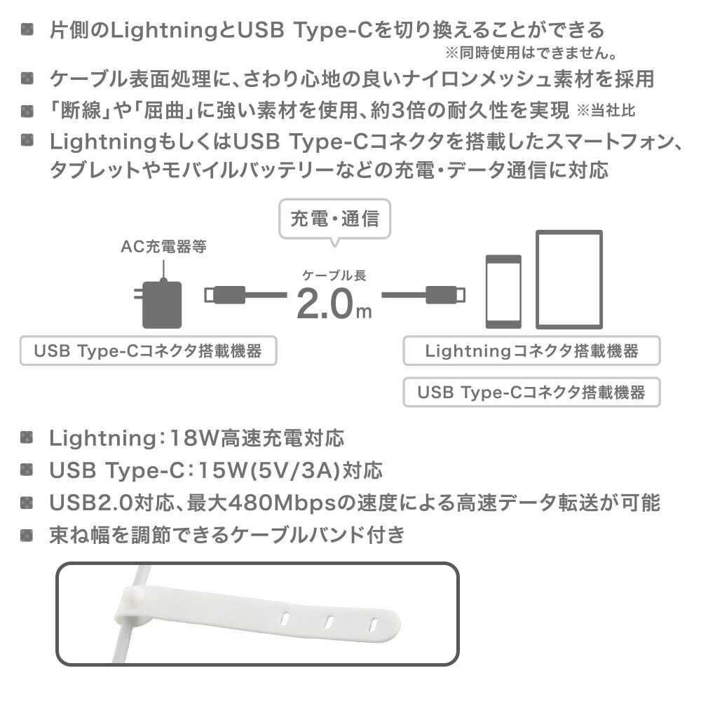 片側、Lightning、USB、Type-C、切り換えることができる、ケーブル表面処理、さわり心地の良いナイロンメッシュ素材を採用、断線、屈曲に強い素材を使用、当社従来品より約3倍の耐久性を実現、Lightningは18W高速充電対応、USBType-Cは15W、5V、3A対応、USB2.0対応、最大480Mbps、高速データ転送が可能、正規認定品、束ね幅を調節できる、ケーブルバンド付き、6ヶ月間保証、カラー、グレー