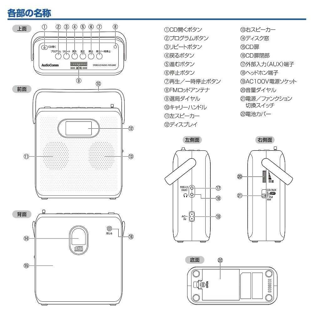 ● コンパクトで持ち運びラクラク、キュービックデザインのCDラジオ ● 背面CDドアのスリムなタテ型スタイル ● 大きく見やすい照明付き液晶表示 ● 口径57mmスピーカー2基搭載、最大出力0.8W+0.8Wのステレオサウンド ● CD-R/RW再生対応、スキップ/サーチ/リピート(1曲/全曲)/プログラム/ランダムと多彩なCD再生機能付き ● AM、FMステレオ、ワイドFM(FM補完放送)受信対応 ● 外部音声入力端子(AUX)付きで、外部機器を接続して外部スピーカーとしてもご利用できます(φ3.5mm接続コード別売) ● ヘッドホン出力端子付き ● コンセント、電池の2電源方式(専用電源コード付属、電池別売)