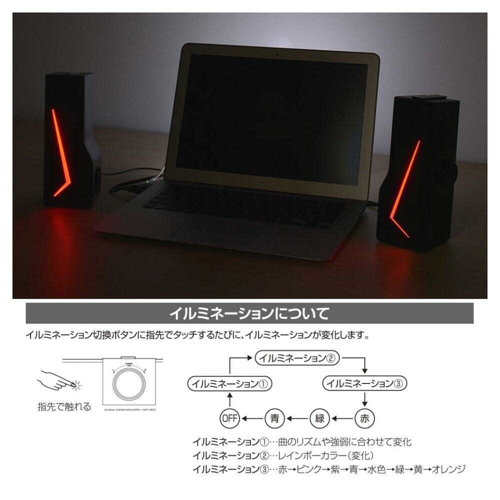 ● 音の遅延が少ない有線接続(3.5mmステレオミニプラグ) ● PC接続(USB Type-A)で家庭用電源不要&自動電源ON ● 縦置き・横置き2WAYフリーレイアウト ● イルミネーションは3バリエーション+固定(赤・緑・青)