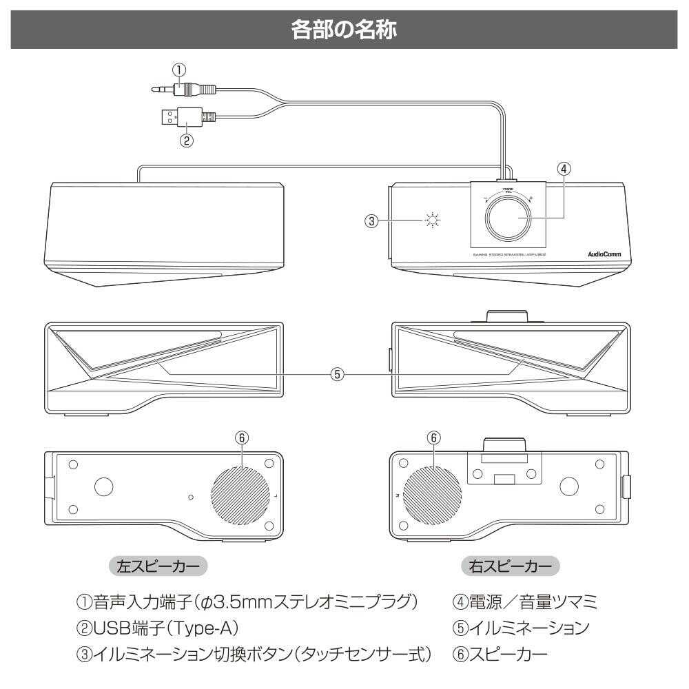 有線接続、3.5mmステレオミニプラグ、PC接続、USB Type-A、家庭用電源不要、自動電源ON、縦置き、横置き、2WAYフリーレイアウト、イルミネーション