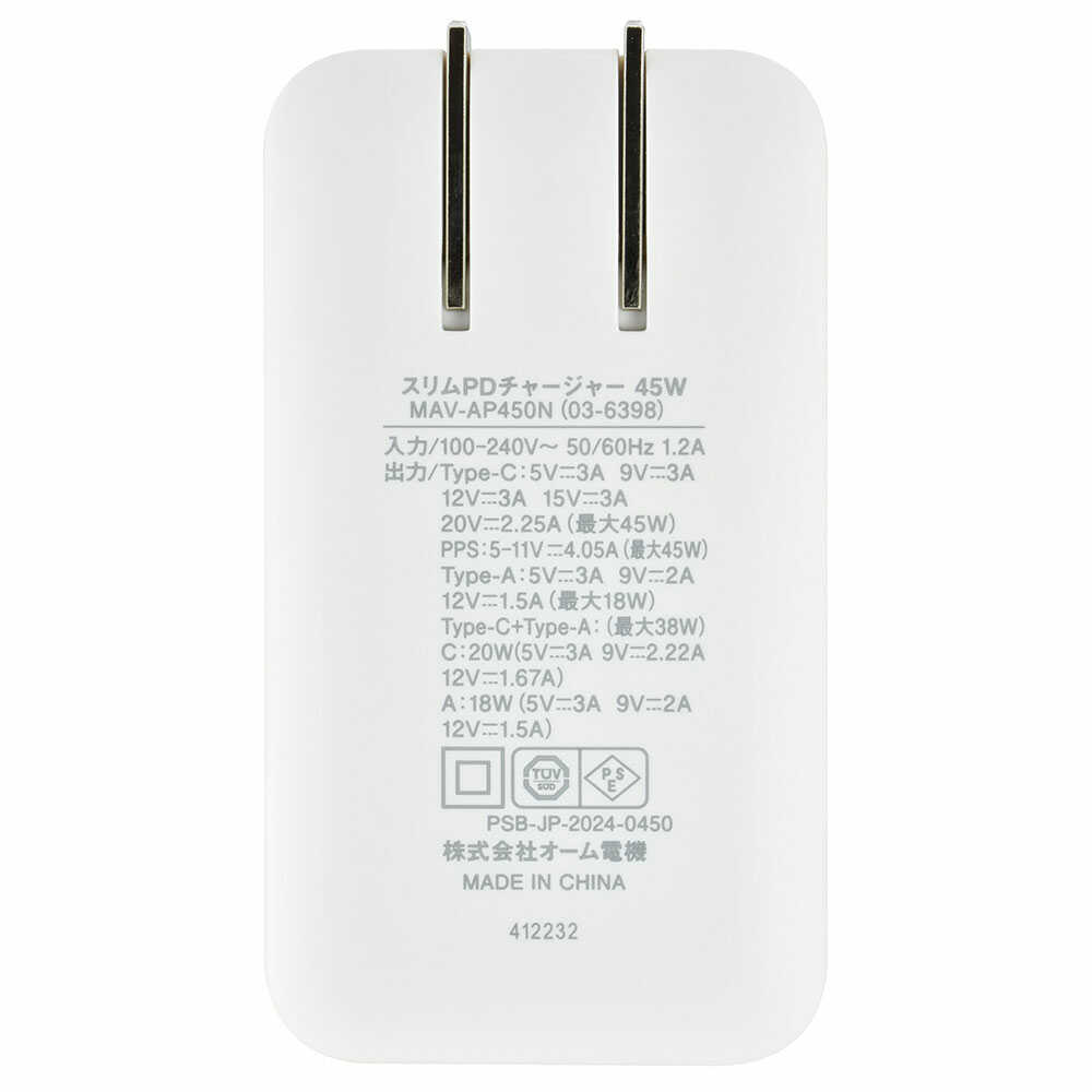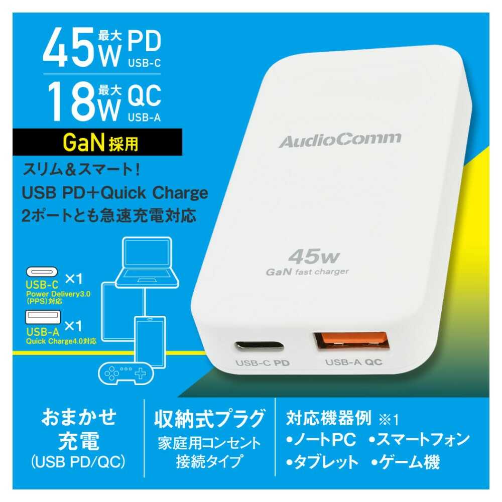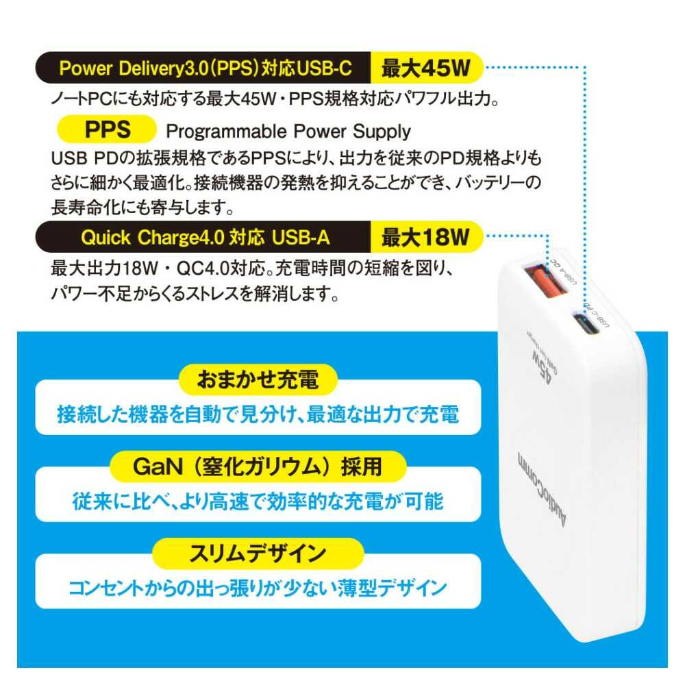 ● 最大出力45W・Power Delivery3.0(PPS)対応USB-C ● USB PDの拡張規格であるPPS(Programmable Power Supply)により、出力を従来のPD規格よりもさらに細かく最適化。接続機器の発熱を抑えることができ、バッテリーの長寿命化にも寄与します。 ● 最大出力18W・QuickCharge4.0対応USB-A ● 接続した機器を自動で見分け、最適な出力で充電(USB PD/QC) ● GaN(窒化ガリウム)採用で従来に比べ、より高速で効率的な充電が可能 ● コンセントからの出っ張りが少ない薄型デザイン ● カバンに入れても邪魔にならない収納式プラグ