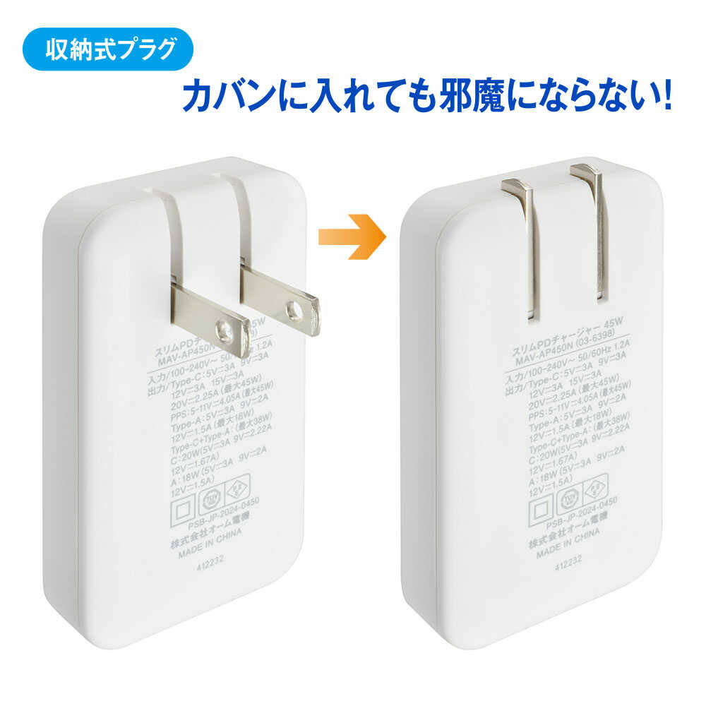 最大出力45W、PowerDelivery3.0、PPS、対応USB-C、USB、PD、拡張規格、PPS、ProgrammablePowerSupply、出力を従来のPD規格よりもさらに細かく、最適化、接続機器の発熱を抑えることができ、バッテリーの長寿命化にも寄与、最大出力18W、QuickCharge4.0対応、USB-A、接続した機器を自動で見分け、最適な出力で充電、USB、PD、QC、GaN、窒化ガリウム採用、従来に比べより高速、効率的な充電が可能、コンセントから出っ張りが少ない薄型デザイン、カバンに入れても邪魔にならない、収納式プラグ