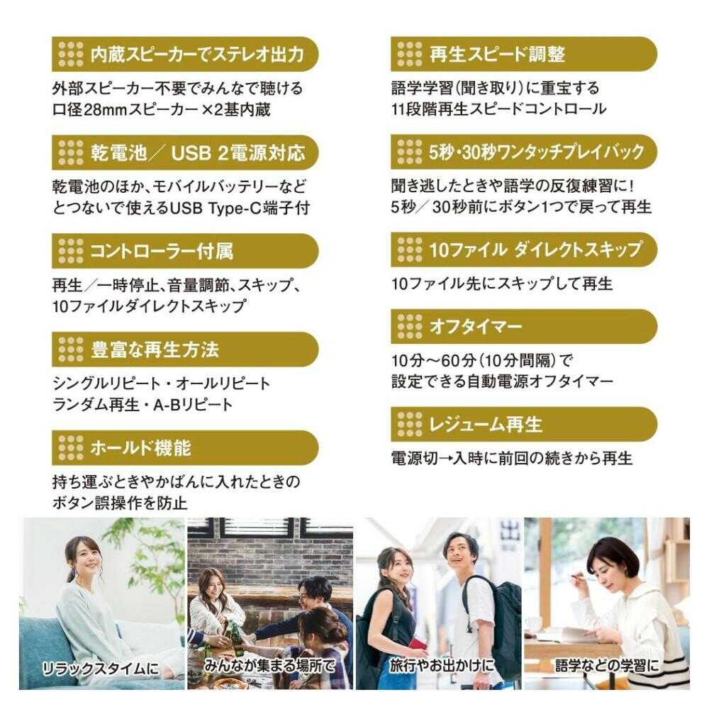 スピーカー内蔵、口径28mmのスピーカー2基搭載、ステレオ出力、乾電池、USB、2電源対応、USB Type-C端子付き、再生/一時停止、音量調節、スキップ、ダイレクトスキップ、コントローラー付属、シングルリピート、オールリピート、ランダム再生、再生機能付きホールド機能付き、誤操作防止、11段階再生スピードコントロール機能付き、語学学習、ワンタッチプレイバック機能付き、語学の反復練習、ダイレクトスキップ機能付き、自動電源オフタイマー機能付き、レジューム再生機能付き、ブラック