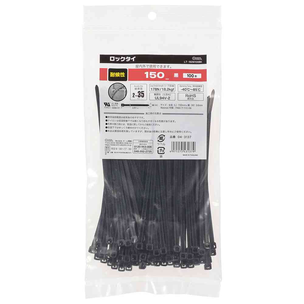 ● 電線の結束、配線のまとめなどに便利です ● 屋内外で使用できる耐候仕様です ● ループ引張強度:178N/18.2kgf ● 使用温度範囲:-40℃~85℃ ● 難燃性(主原料):UL94V-2 ● RoHS適合品