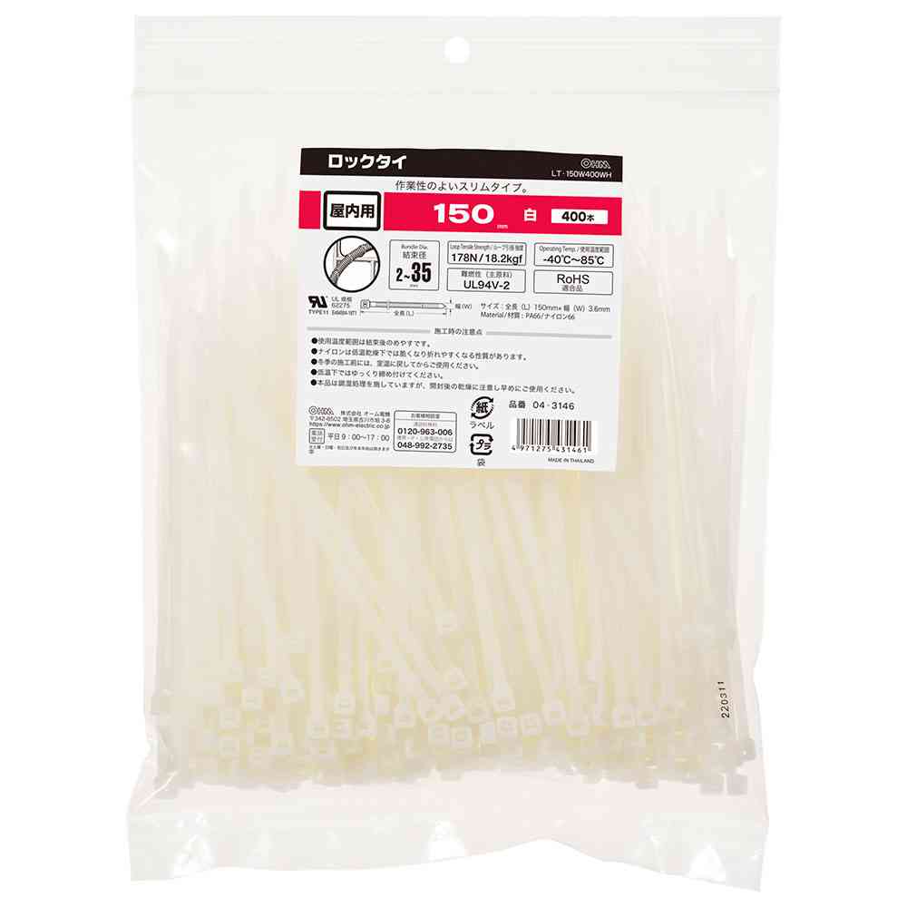 ● 電線の結束、配線のまとめなどに便利です ● 作業性のよいスリムタイプ ● 屋内用 ● ループ引張強度:178N/18.2kgf ● 使用温度範囲:-40℃~85℃ ● 難燃性(主原料):UL94V-2 ● RoHS適合品