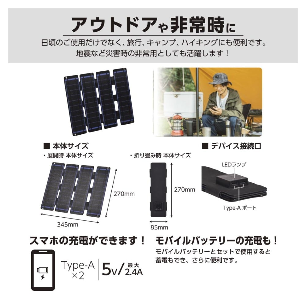 ● アウトドアや防災に便利 ● 最大発電性能 14W ● 出力端子:USB Type-Aポート×2(5V/最大2.4A) ● スマホやモバイルバッテリーの充電に