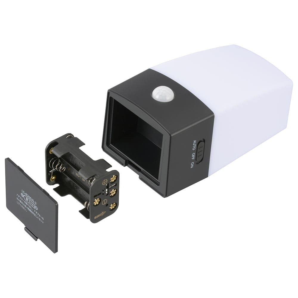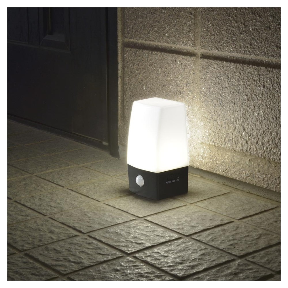 明暗センサー、人感センサー付き、周囲が暗くなると人を検知、点灯、離れてしばらくすると自動消灯、屋外でも使える、防まつ形、IPX4、常時点灯モード付き、乾電池式、単3形乾電池×6本使用、昼白色、明るさ210ルーメン、置き型タイプ