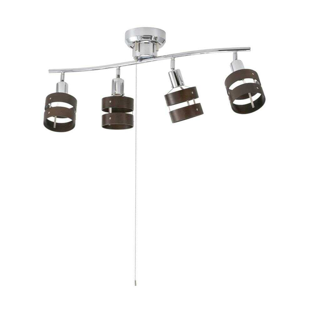 ● 木とスチールの組み合わせがおしゃれな4灯シーリングライト ● 4つのセードがそれぞれ自由に角度を変えられます。 ● プルスイッチなので壁スイッチがない場所でも使えます ●点灯パターン:4灯 → 2灯(内側)→ 2灯(外側)→ 消灯