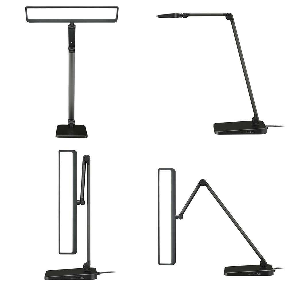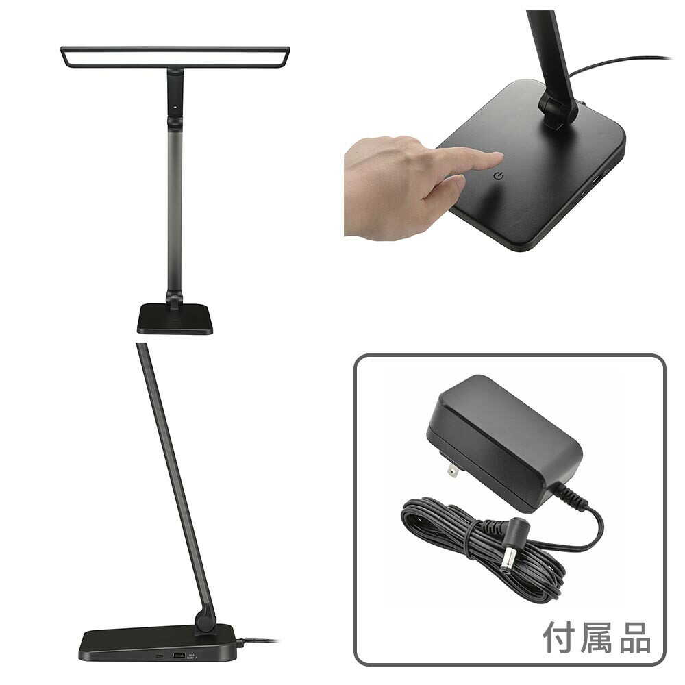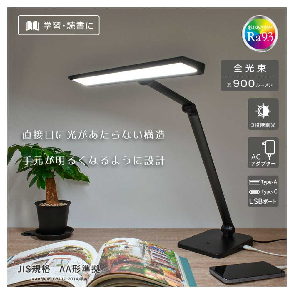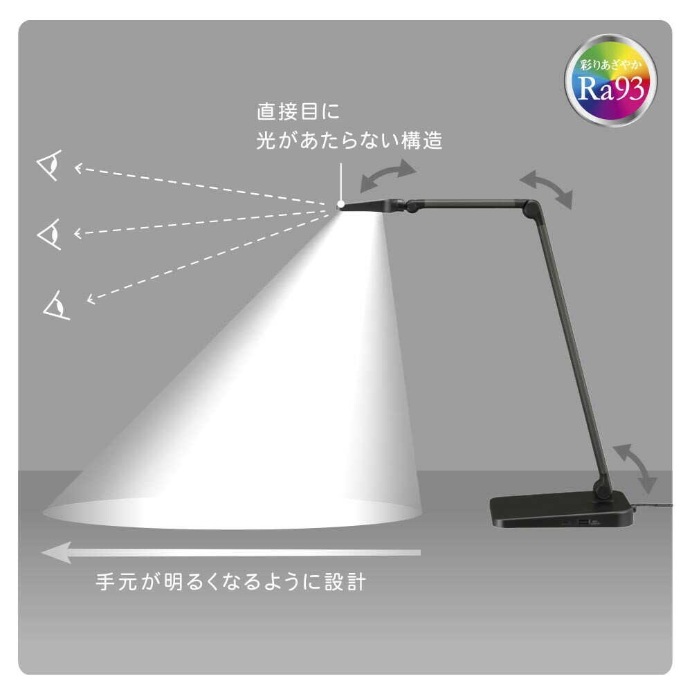直接目に光があたらない構造、手元が明るくなるように設計、USBType-C、USBType-A搭載、彩りあざやか、Ra93、広く照らせる、横幅35cmセード、タッチ式3段階調光、角度調整できる、全光束約900ルーメン、ブラック
