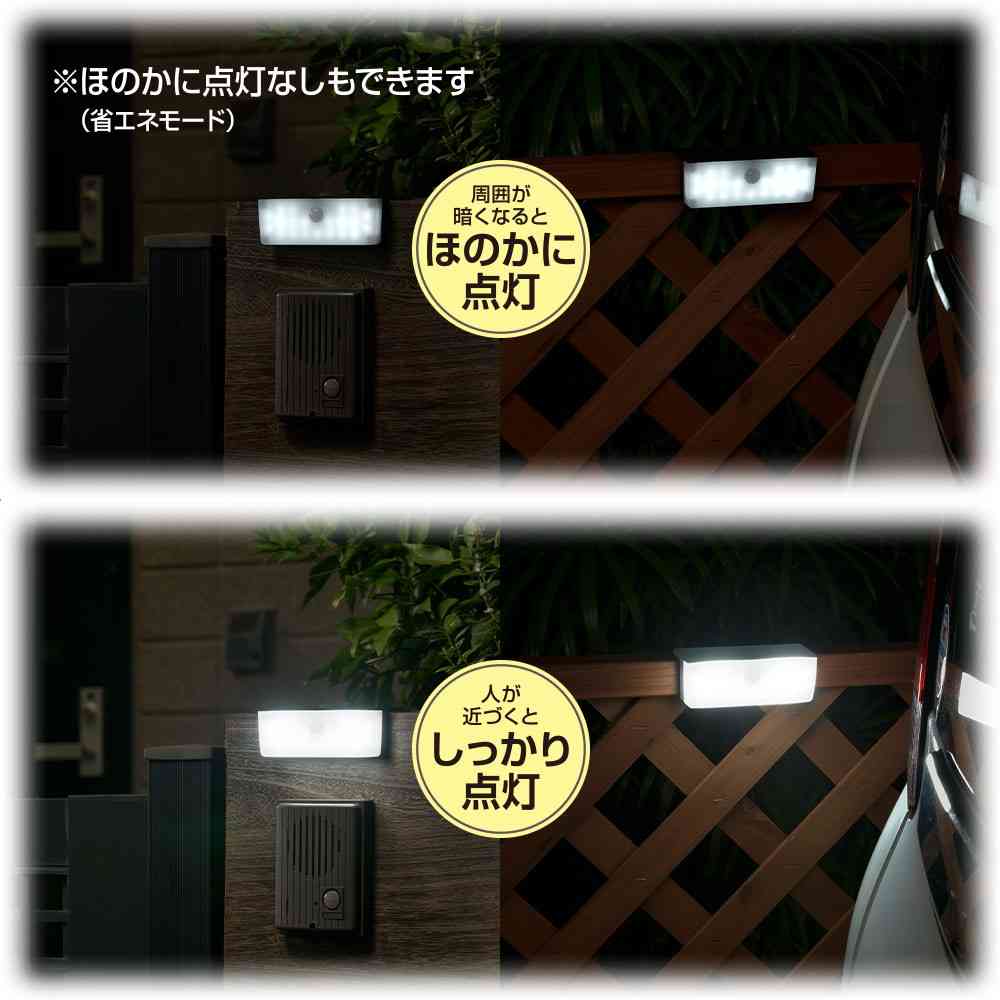 ● コンセントがない場所に設置できるソーラー発電式 ● 昼の間に充電、暗くなったら人感センサーで検知して点灯 ● 明るさ(約)100ルーメン ● 選べる2つのモード ・ 周囲が暗くなるとほのかに点灯、動きを検知するとしっかり点灯モード(通常モード) ・ 周囲が暗くなっても点灯せず、動きを検知した時だけしっかり点灯モード(省エネモード) ● IP65の防じん防水性能 ● 付属の両面テープやお手持ちのネジで取り付け