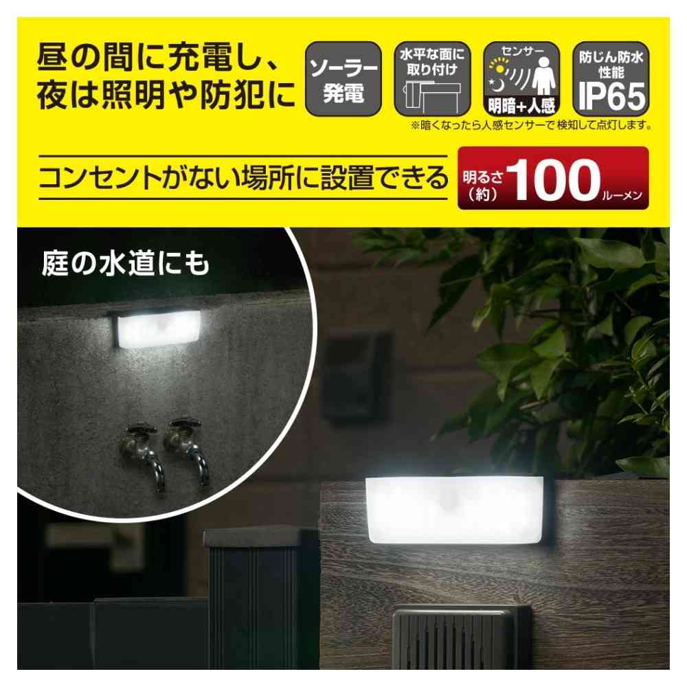 コンセントがない場所に設置できる、ソーラー発電式、昼の間に充電、暗くなったら人感センサー、検知、点灯、明るさ(約)100ルーメン、選べる2つのモード、周囲が暗くなるとほのかに点灯、動きを検知するとしっかり点灯モード、通常モード、周囲が暗くなっても点灯せず、動きを検知、しっかり点灯モード、省エネモード、IP65、防じん防水性能