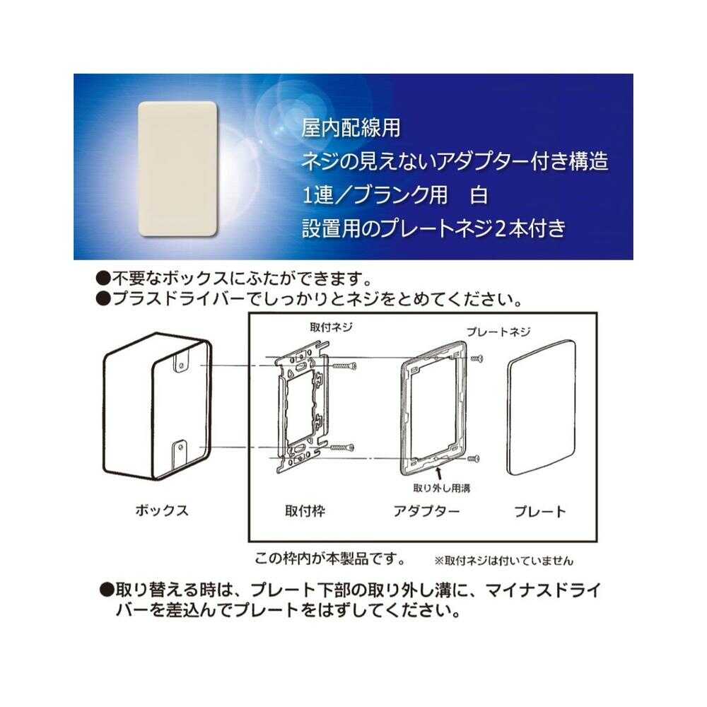●不要なボックスにフタができます。 ●ネジの見えないアダプター付き構造です。 ●設置用のプレートネジ2本付きです。 ●屋内配線用。