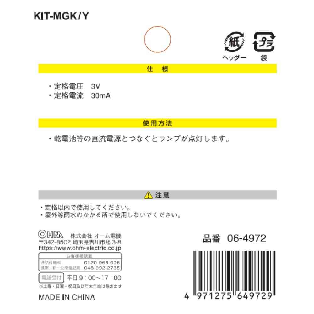 工作用、ムギ球、DC3V用、色、黄、イエロー