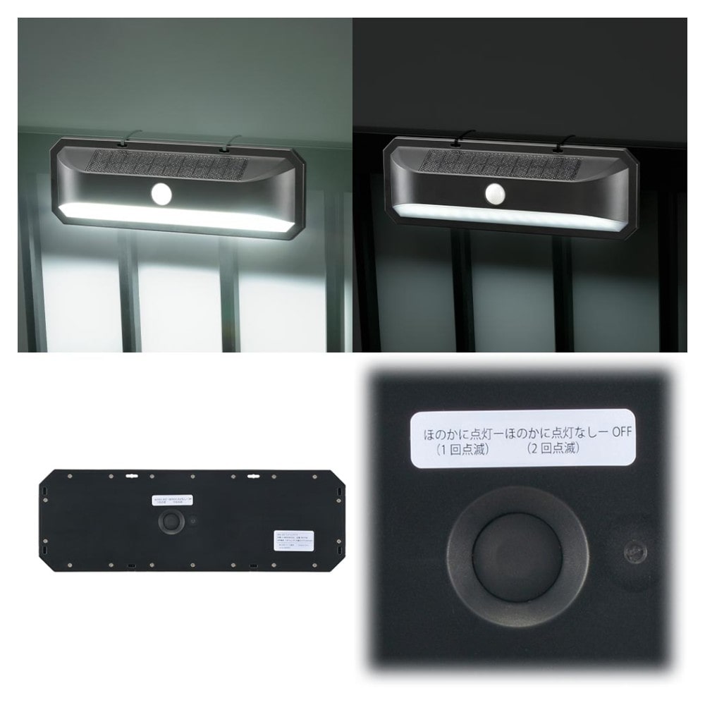 ● コンセントがない場所に設置できるソーラー発電式 ● 昼の間に充電、暗くなったら人感センサーで検知して点灯 ● 明るさ(約)800ルーメン ● 選べる2つのモード ・ 周囲が暗くなるとほのかに点灯、動きを検知するとしっかり点灯モード(通常モード) ・ 周囲が暗くなっても点灯せず、動きを検知した時だけしっかり点灯モード(省エネモード) ● IP65の防じん防水性能