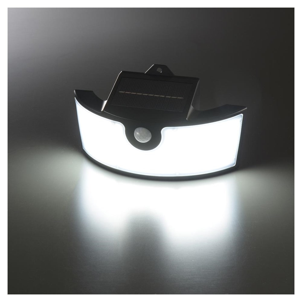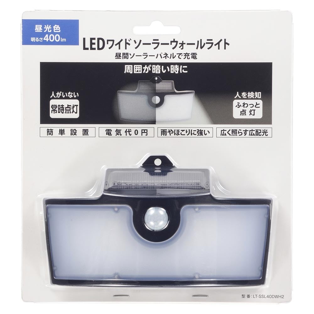 昼間、ソーラーパネルで充電、暗くなると常時点灯、人を検知すると強点灯、約10秒間点灯、自動で常時点灯、 センサーが検知しない場合、優しい明かりで周囲を照らす、常時点灯モード、センサーが検知した場合、ふわっと照らす、点灯モード、約10秒強点灯、簡単設置、電気代0円、雨やほこりに強い、広く照らす広配光、昼光色、明るさ400ルーメン
