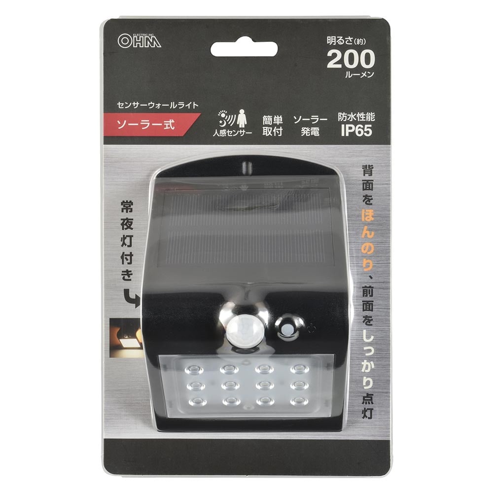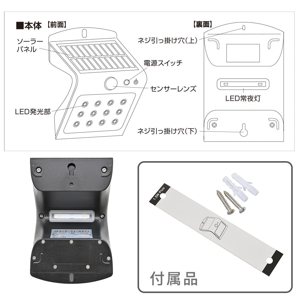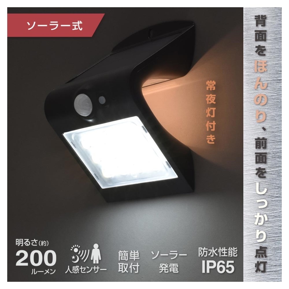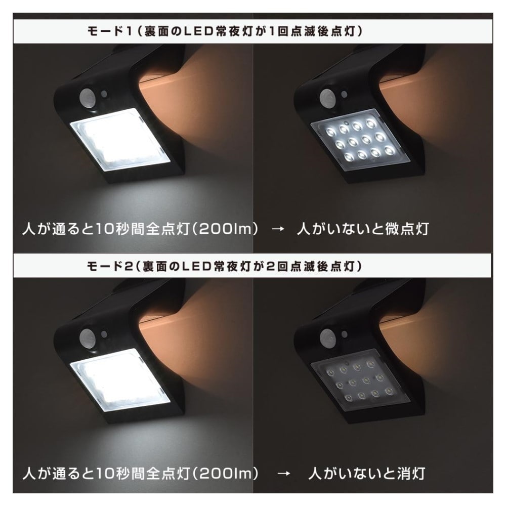 ソーラー発電式、人感センサーライト、常夜灯、背面をほんのり点灯、前面をしっかり点灯、選べるセンサーモード、人が通ると10秒間全点灯、人がいないと微点灯、人が通ると10秒間全点灯、人がいないと消灯、人感センサー、検知範囲は最大約120°、最長約3m、防水性能IP65、雨に濡れる場所で使用、付属ネジ、スリーブ、簡単取付、明るさ200ルーメン