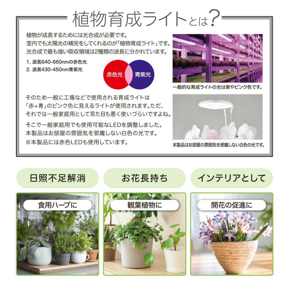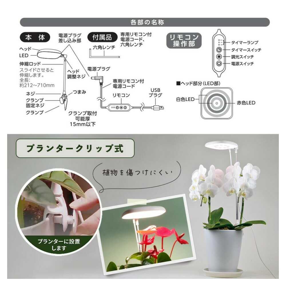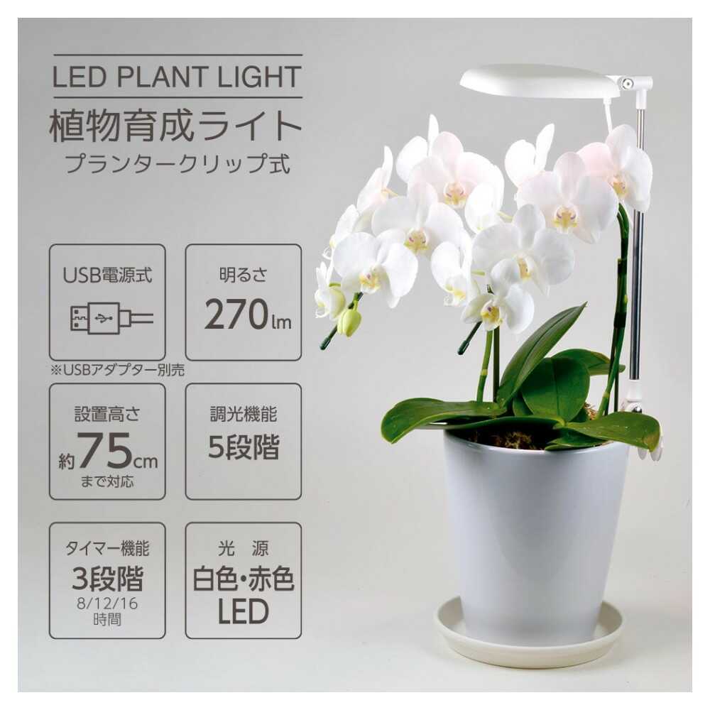 室内で太陽光の補完、植物育成ライト、お部屋に馴染む白色の光、5段階調光機能付き、自動で点灯消灯を繰り返す、オートタイマー機能付き、タイマー、3段階、8時間点灯、12時間点灯、16時間点灯、プランターにはさむだけの簡単設置、設置高さ約75cmまで対応、USB電源式、USBアダプター別売