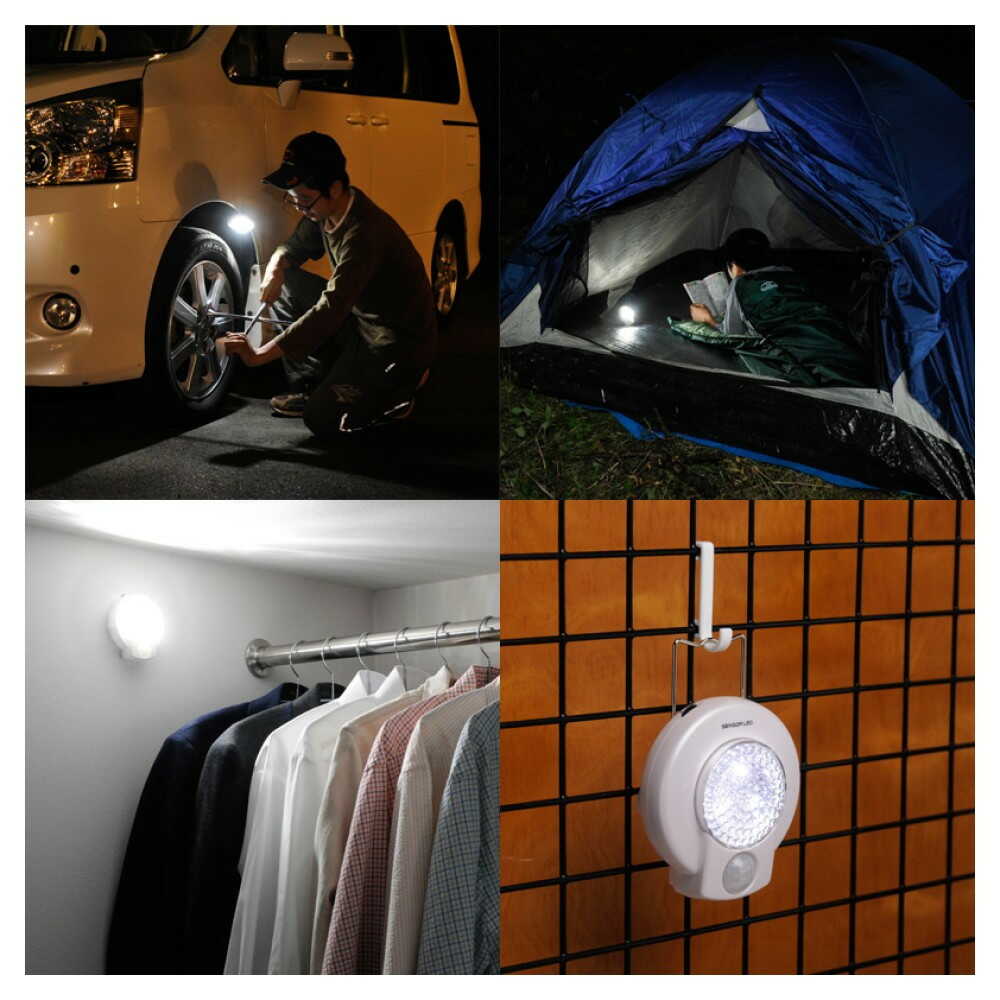 ●ハンディライト+人感&光センサーLEDライト ●光(明暗)センサーは反応明度が調整できます。 ●人感センサーは点灯時間が設定できます。(10秒/30秒/90秒) ●電源・配線不要の乾電池式 ●手動(常時点灯)に切り替えれば懐中電灯や卓上用ライトに ●ライトの明るさも自由に調節 ●「奥く」「吊下げ」「マグネット取付」「壁掛け」の4通りにご使用できます。 ●最長電池寿命は約420時間(明るさ最少の場合)