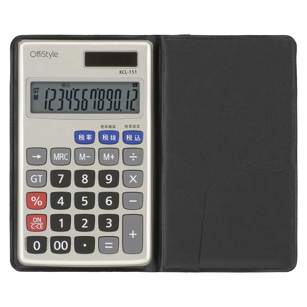 電卓、ソーラーパネル、電池、ダブルパワー、手帳カバー付属、持ち歩きに便利、税計算機能、簡単設定、12桁表示、早打ち対応、修正キー