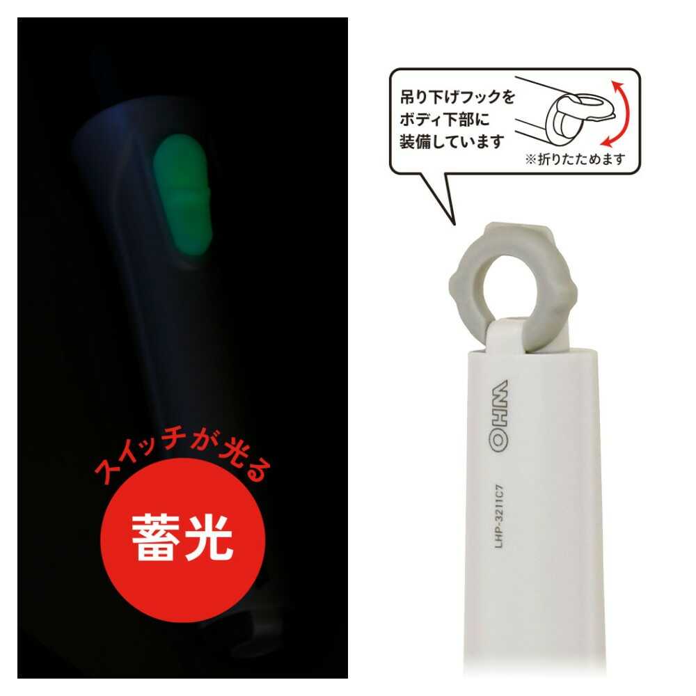 消灯後に光る蓄光スイッチ、停電時、吊り下げフック、アルカリ乾電池付属、常備灯、防災等