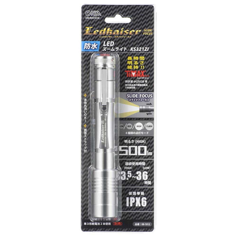 スライドフォーカス機能付き、4種類点灯モード、明るさ500ルーメン、連続使用時間HIGHモード3.5時間、LOWモード36時間、保護等級IPX6、本体丸洗いOK、携帯用クリップ、ストラップ付き、長時間明るさ維持、TIMAX IC搭載