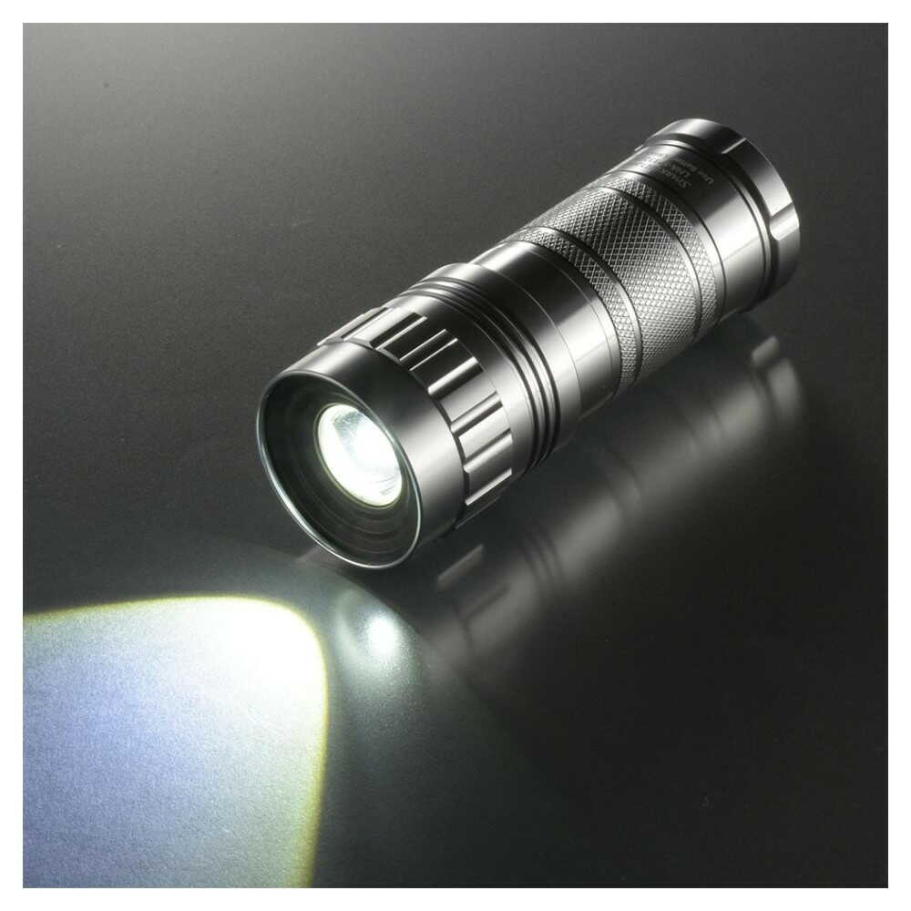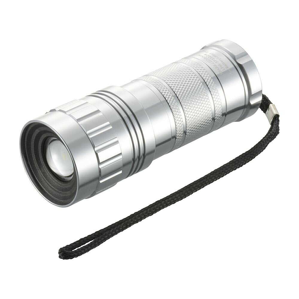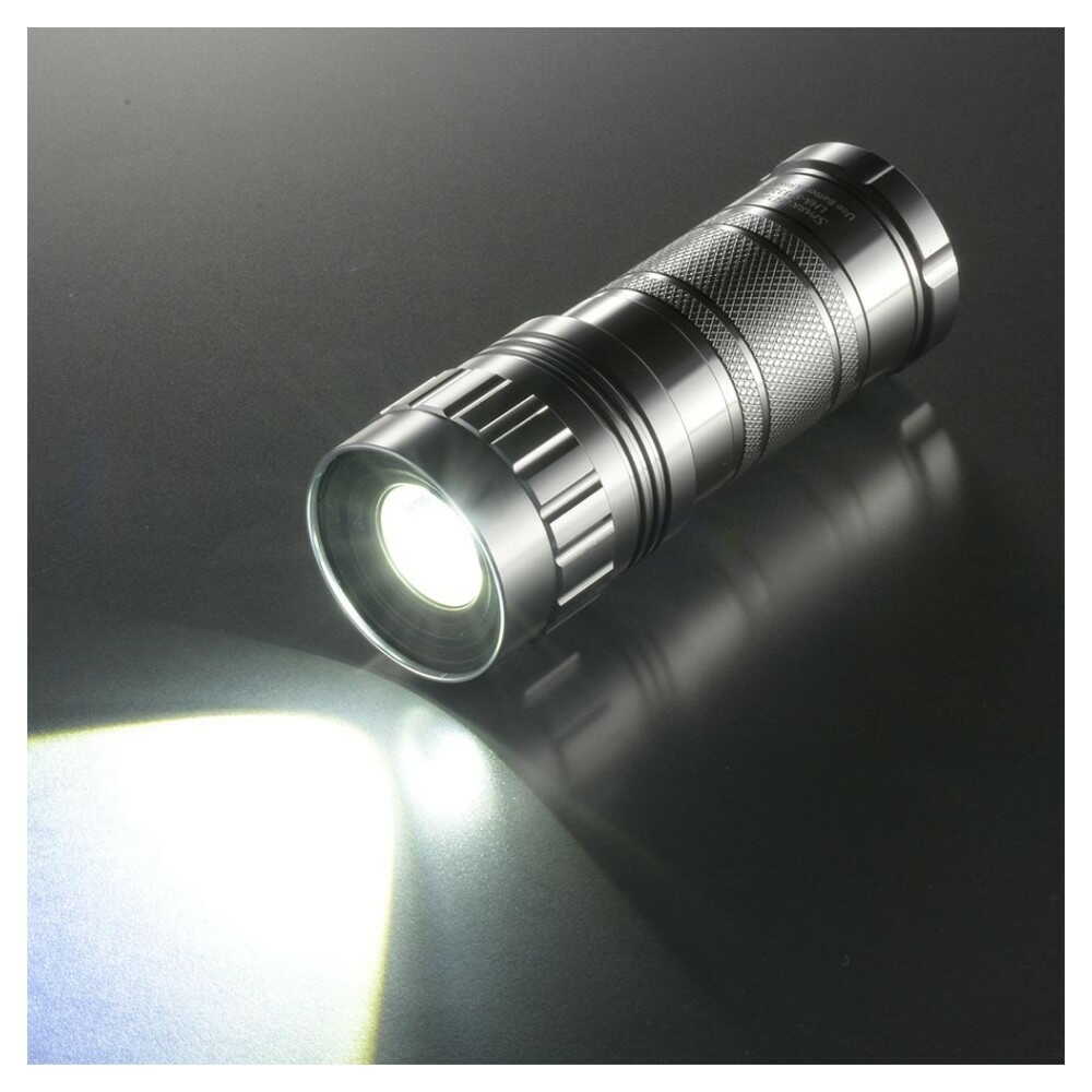 スライドフォーカス機能付き、保護等級IP66、耐じん、耐水形、調光機能2モード、連続使用時間HIGHモード1時間、LOWモード17時間、800ルーメン、10400カンデラ、アルミボディ、携帯ストラップ付