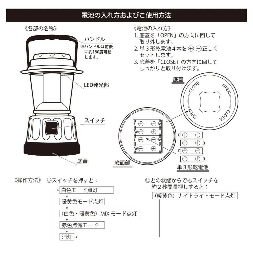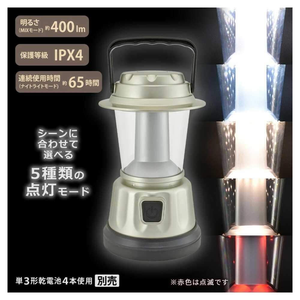 シーンに合わせて選べる、5種類の点灯モード、赤色点滅モード、ナイトライトモード、暖黄色、暖黄色モード、白色モード、MIXモード、白色、暖黄色、明るさ約400lm、MIXモード、連続使用時間約65時間、ナイトライトモード、保護等級IPX4、単3形乾電池4本使用、別売
