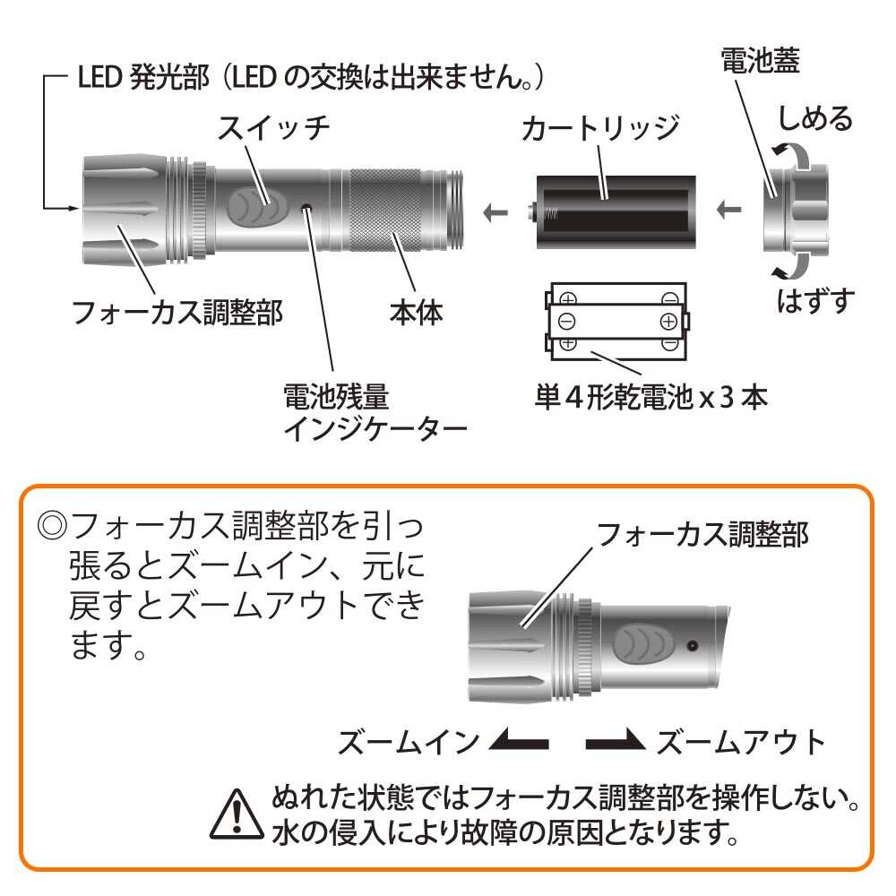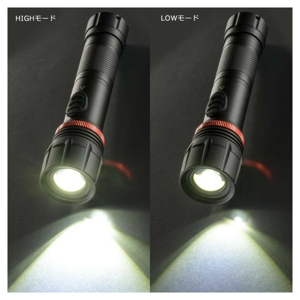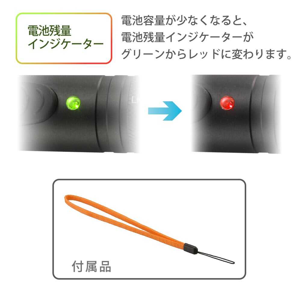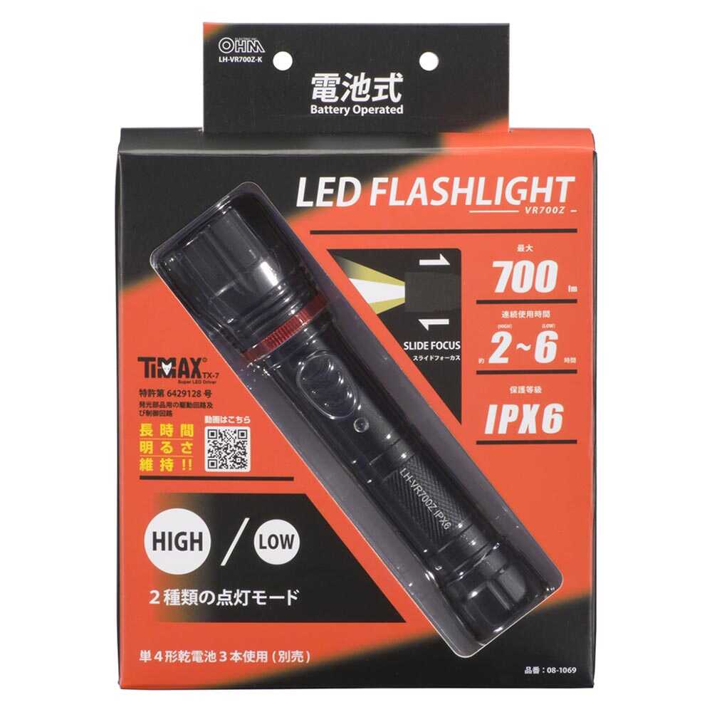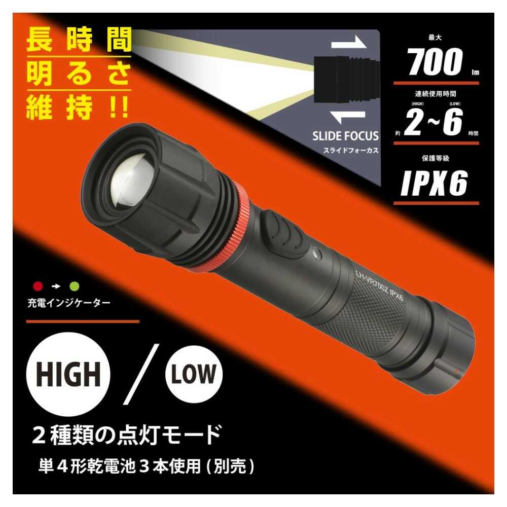 スライドフォーカス機能付き、電池式LEDフラッシュライト、2種類点灯モード、長時間明るさ維持、TIMAX IC搭載明るさ最大700ルーメン、保護等級IPX6、耐水形、照射距離約169m、電池残量インジケーター、黒