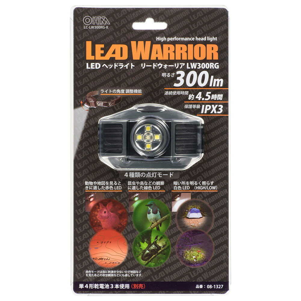 明るさ300lm、LEDヘッドライト、4種類の点灯モード、赤色LED、緑色LED、白色LED、連続使用時間約4.5時間、ライト角度調整機能、保護等級IPX3、防雨形