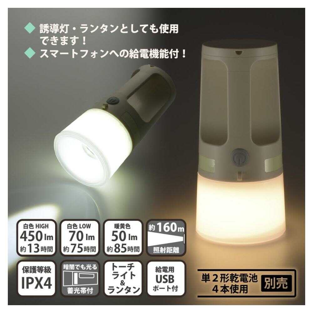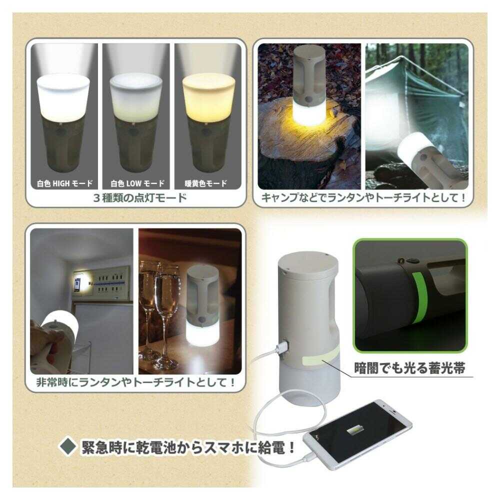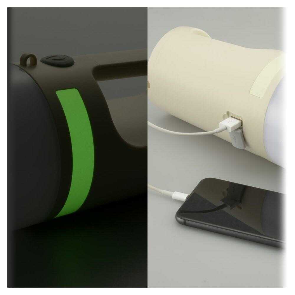 誘導灯、ランタン、給電用USBポート付き、スマートフォンへ給電、3種類点灯モード、白色HIGH、白色LOW、暖黄色、6400カンデラの明るさ、連続使用時間約13時間、照射距離約160m、落下耐性1m、暗闇でも光る蓄光帯付き