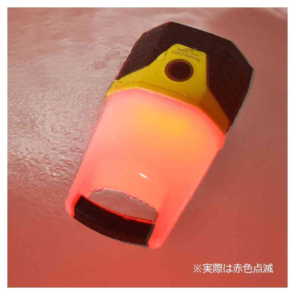 フロート構造、水などに底部が触れると自動的に赤色点滅、3種、白色HIGH、白色LOW、赤色点滅の点灯モード、単2形乾電池3本、単3形乾電池3本、2種類の電池で使用可能、IPX6の耐水形、約2mからの落下衝撃に耐えられる、ハンドル付き、夜間作業、アウトドア、非常時の警告灯補助