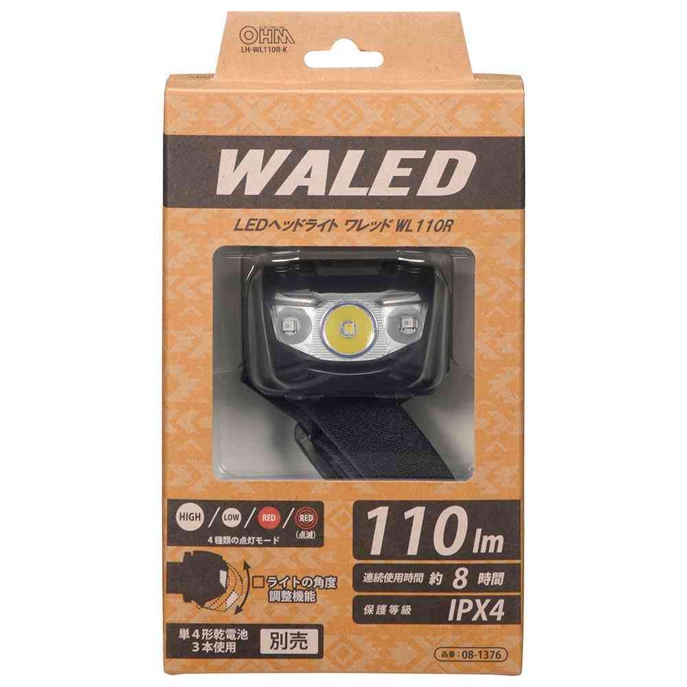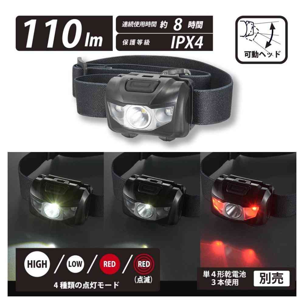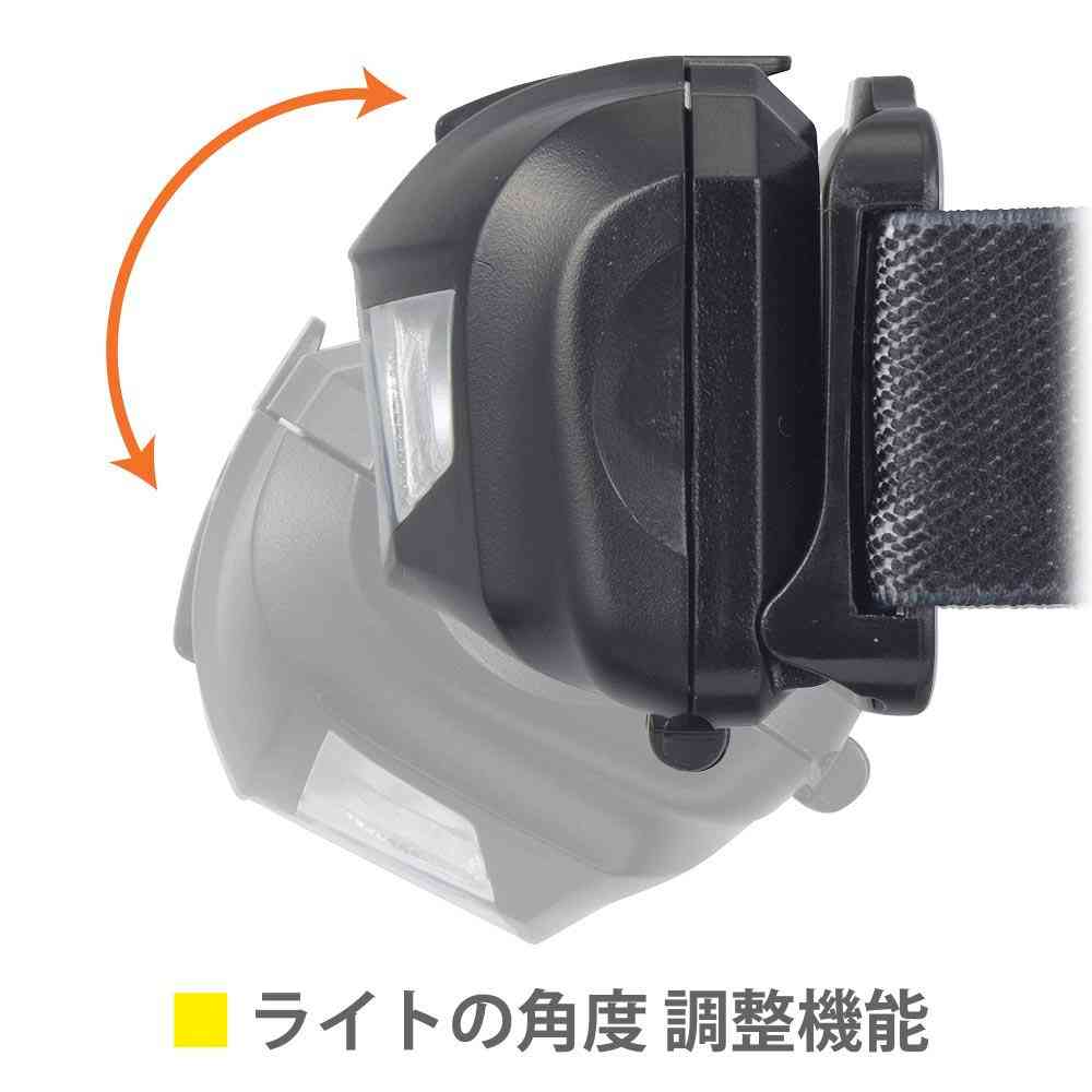角度を調整、4種類の点灯モード、HIGH、LOW、RED、RED点滅、明るさ110ルーメン、HIGH点灯時、連続使用約8時間、HIGH点灯時、落下耐久1m、照射距離65m、IPX4の防まつ形、FL1、STANDARD
