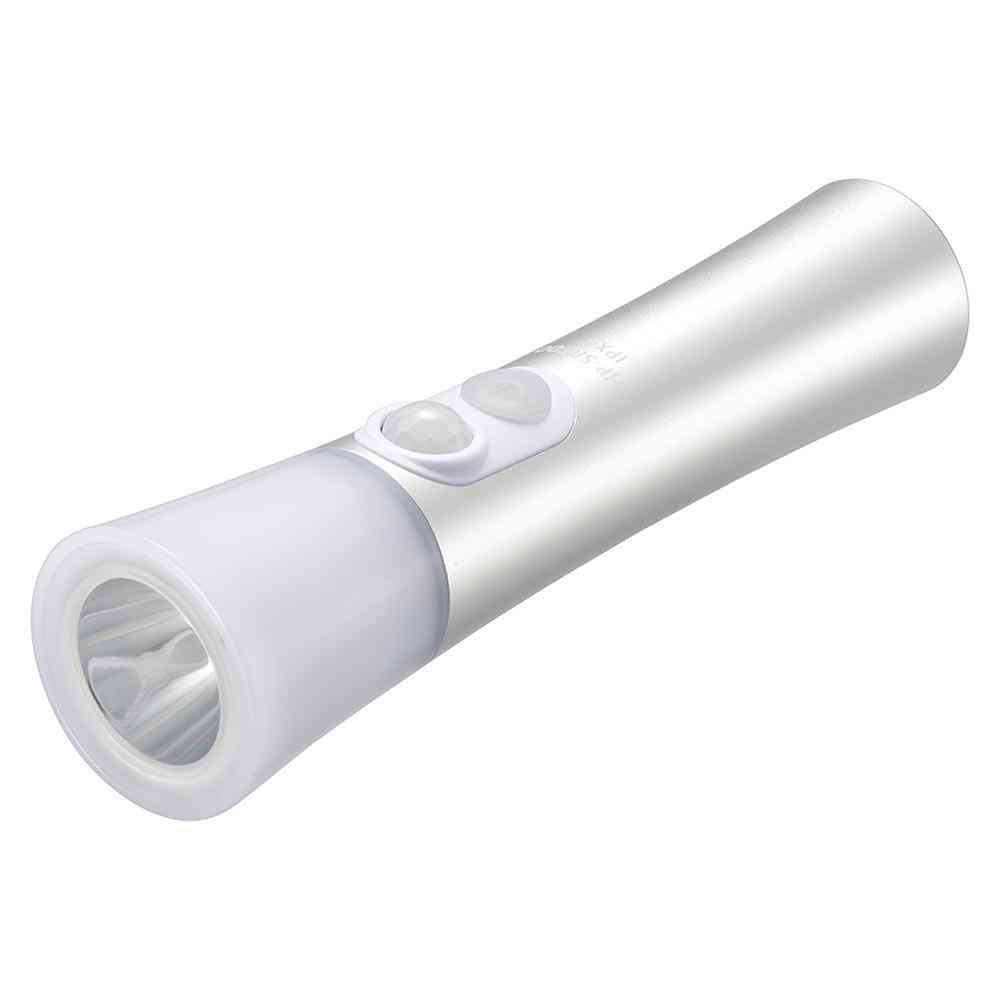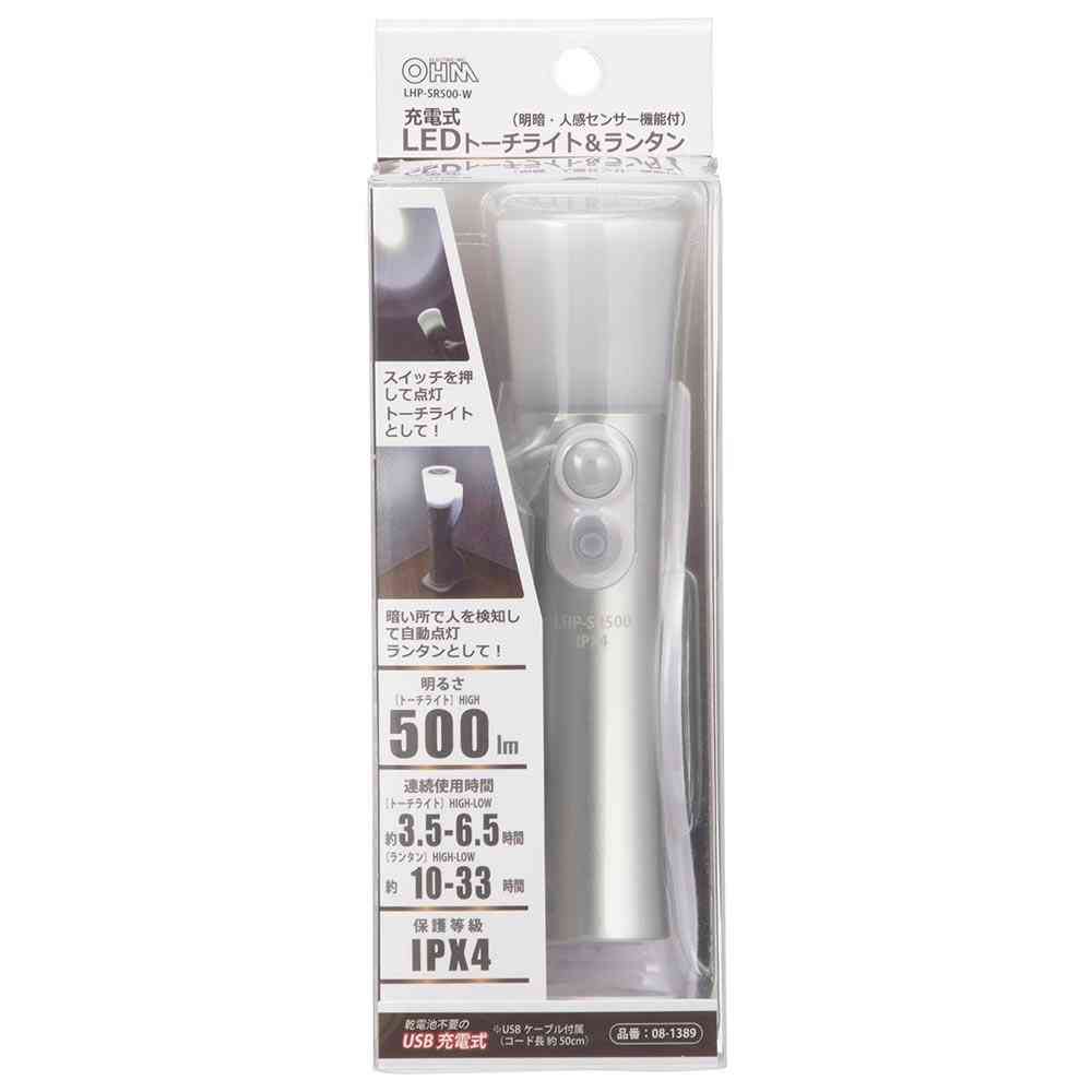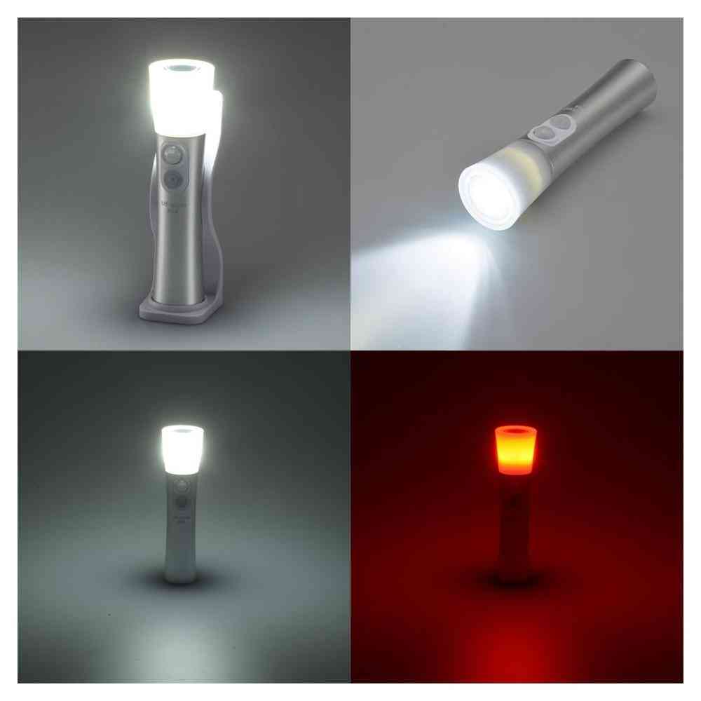 トーチライト、ランタン、スタンドに立てかけると暗い所で人を検知、自動点灯、消灯、調光、HIGH、LOW、赤色点灯、赤色点滅モード付き、明るさ500ルーメン、トーチライト、HIGHモード時、保護等級はIPX4、防まつ形、乾電池不要、USB充電式