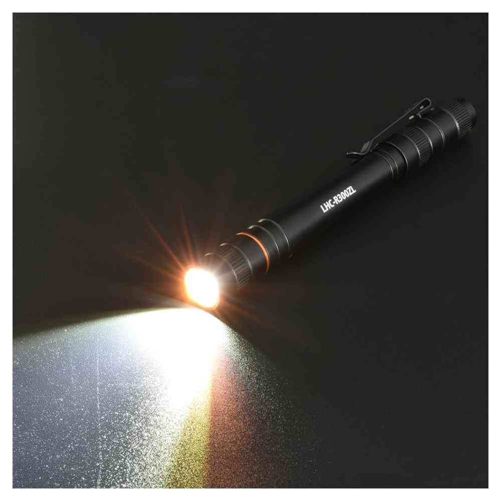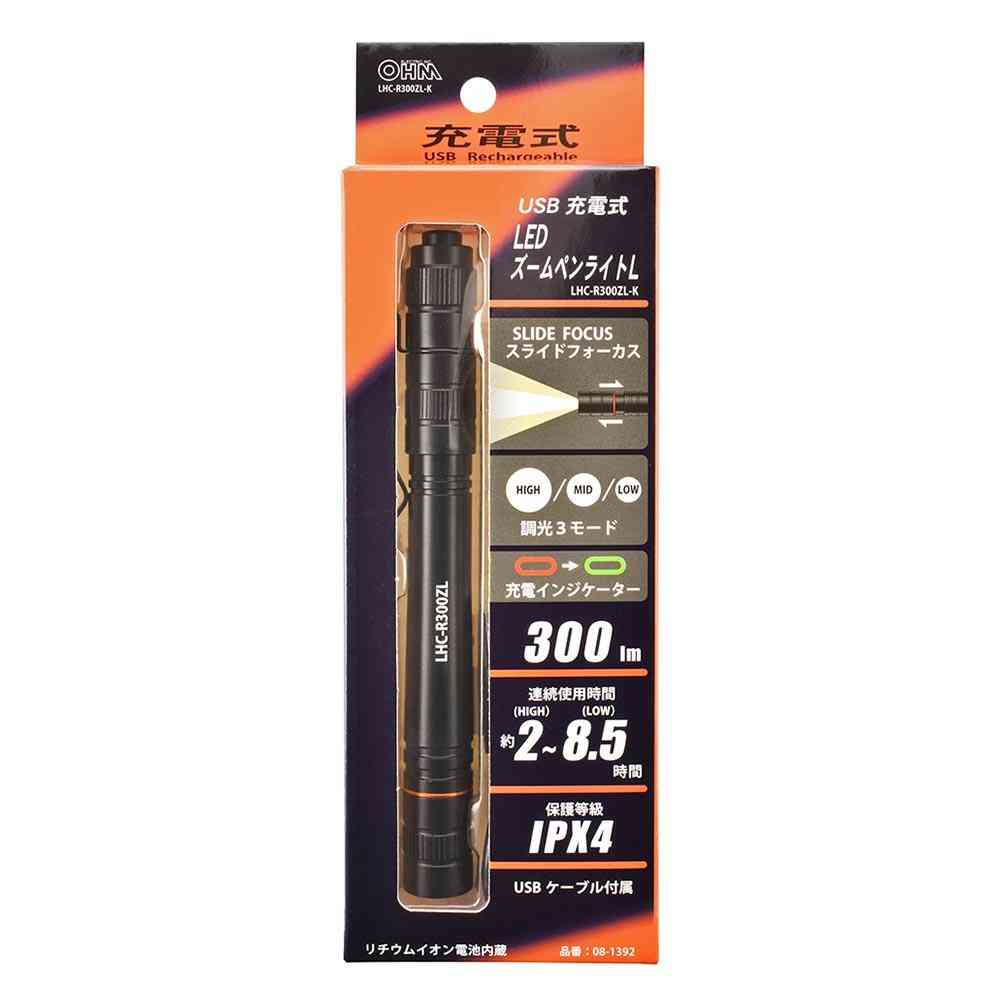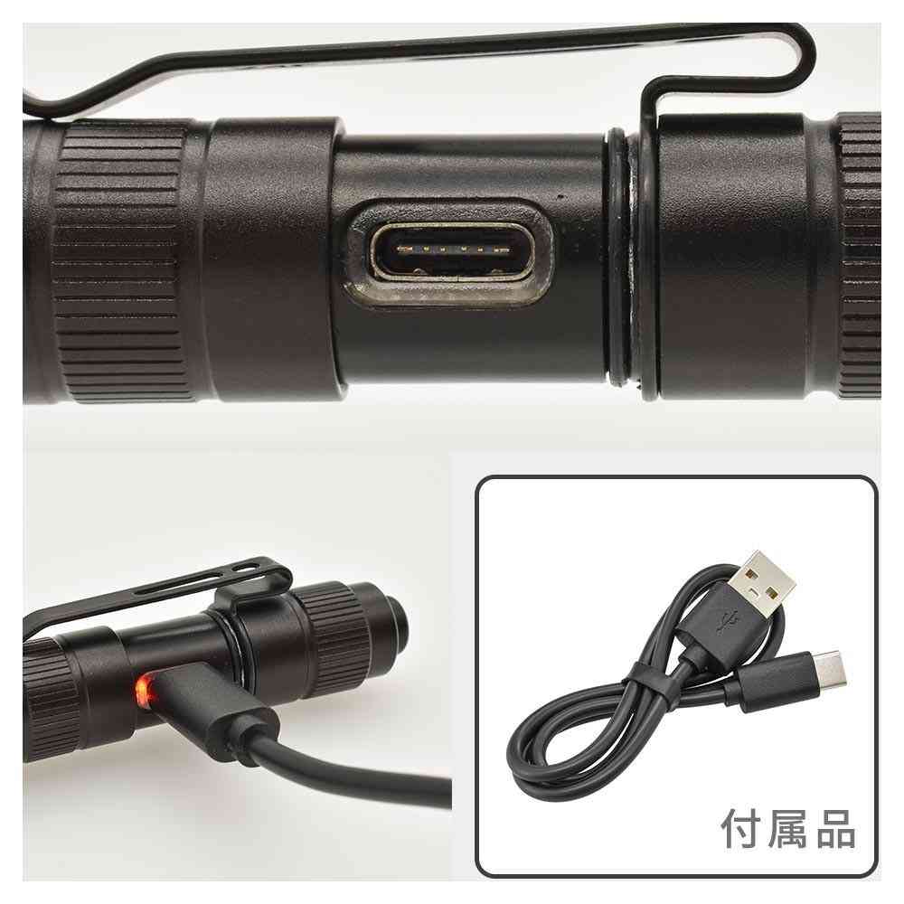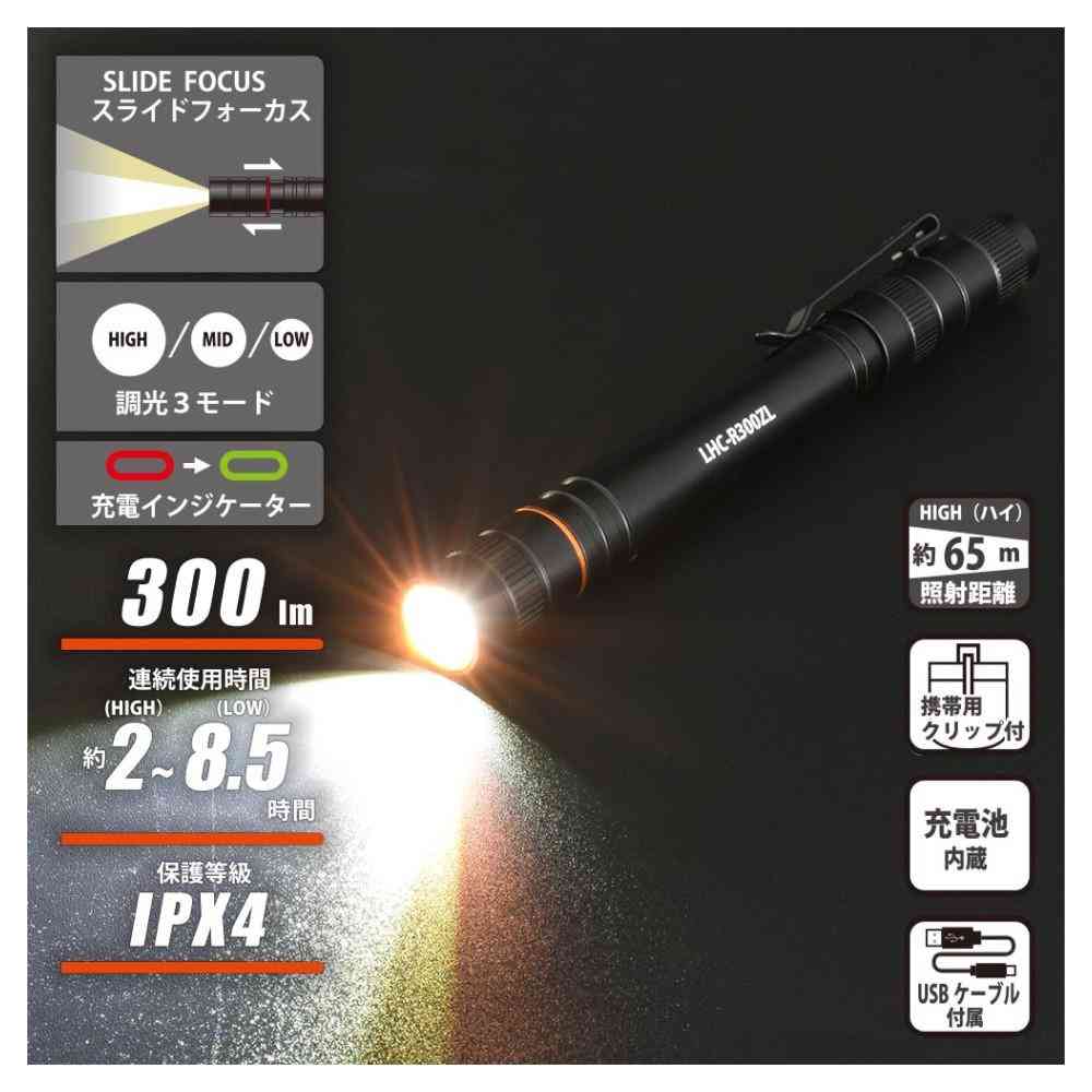 スライドフォーカス機能付き、3種類の調光モード、300ルーメン、保護等級IPX4の防まつ形、USB充電式、携帯用クリップ付き、FL1、STANDARD