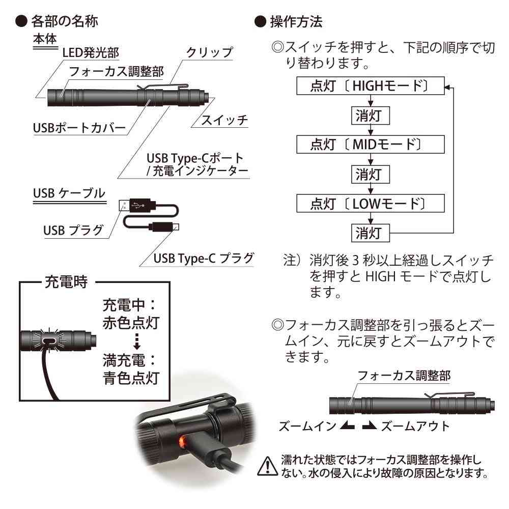 ● スライドフォーカス機能付き ● 3種類の調光モード(HIGH/MID/LOW) ● 全光束はHIGHモードで300ルーメン ● 連続使用時間はLOWモードで約8.5時間 ● 保護等級IPX4の防まつ形 ● USB充電式 ● 携帯用クリップ付き ● FL1 STANDARD(アメリカ ANSI/NEMA FL1-2009規格)準拠