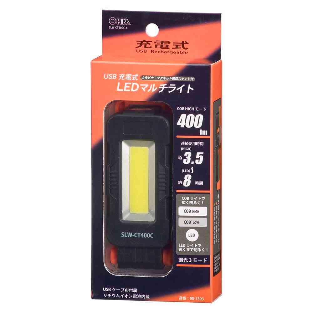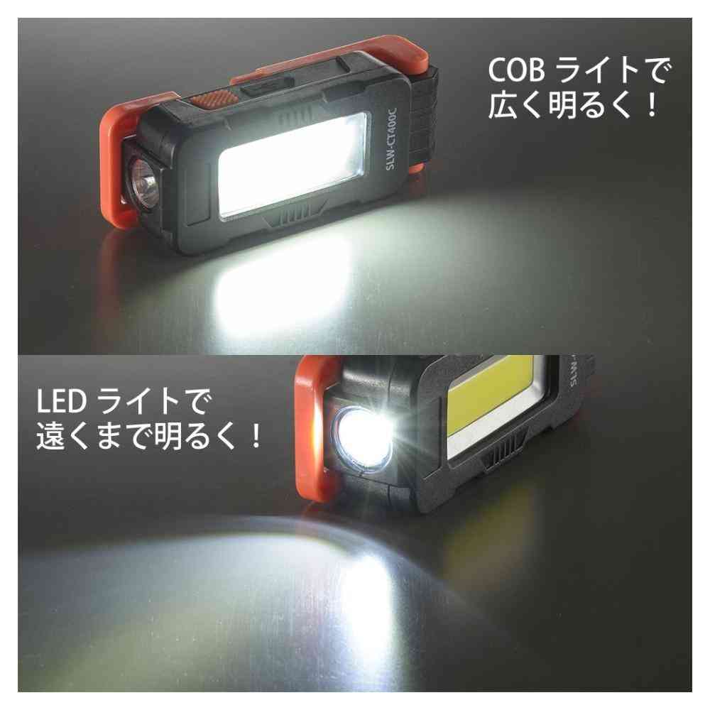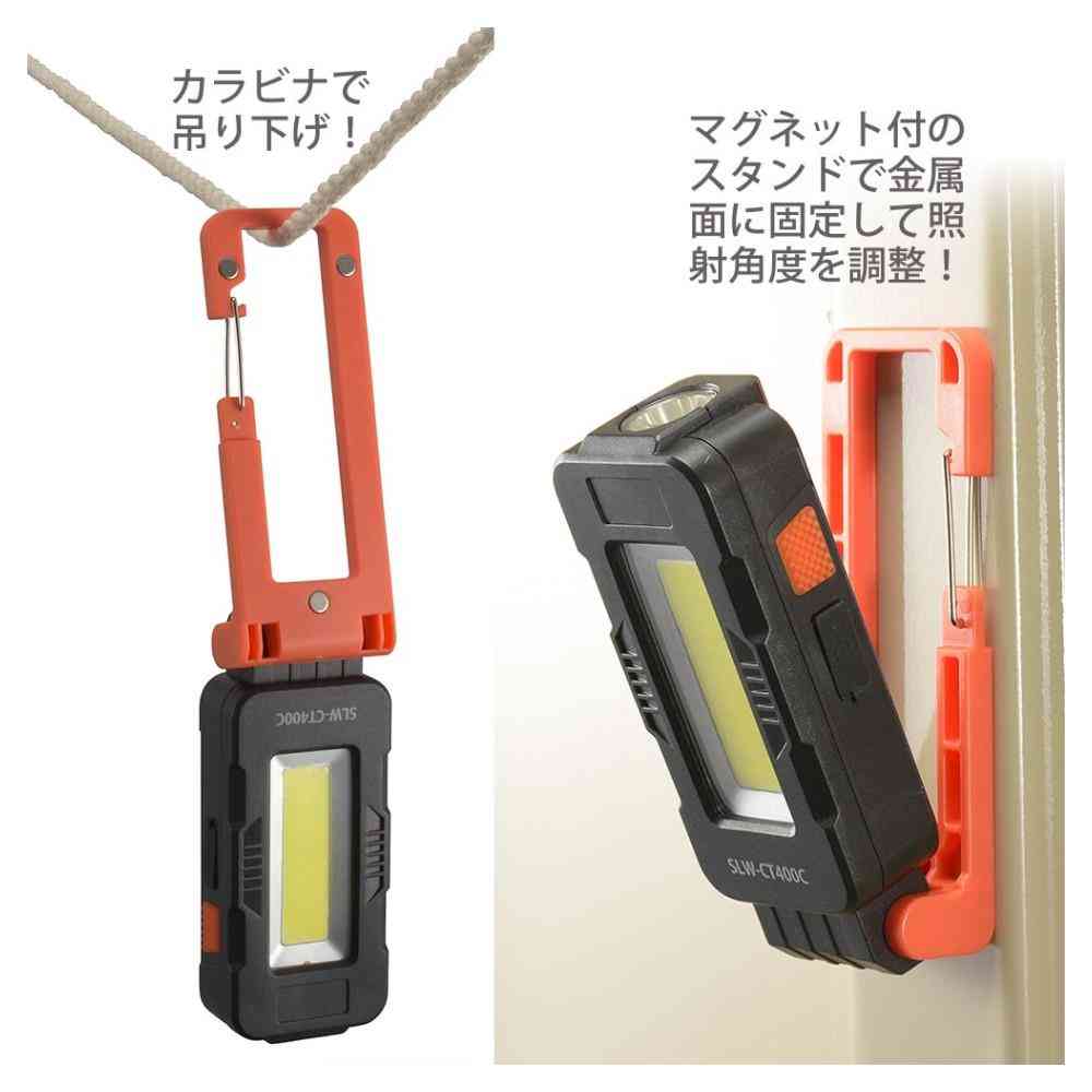 USB充電式、充電インジケーター付き、カラビナ、マグネット開閉スタンド付き、金属面に固定、照射角度を調整、カラビナで吊り下げ、調光3モード、COBライト、LEDライト、COBHIGHモード、400ルーメン、連続使用時間約3.5~約8時間、LED、USBケーブル付属、リチウムイオン電池内蔵