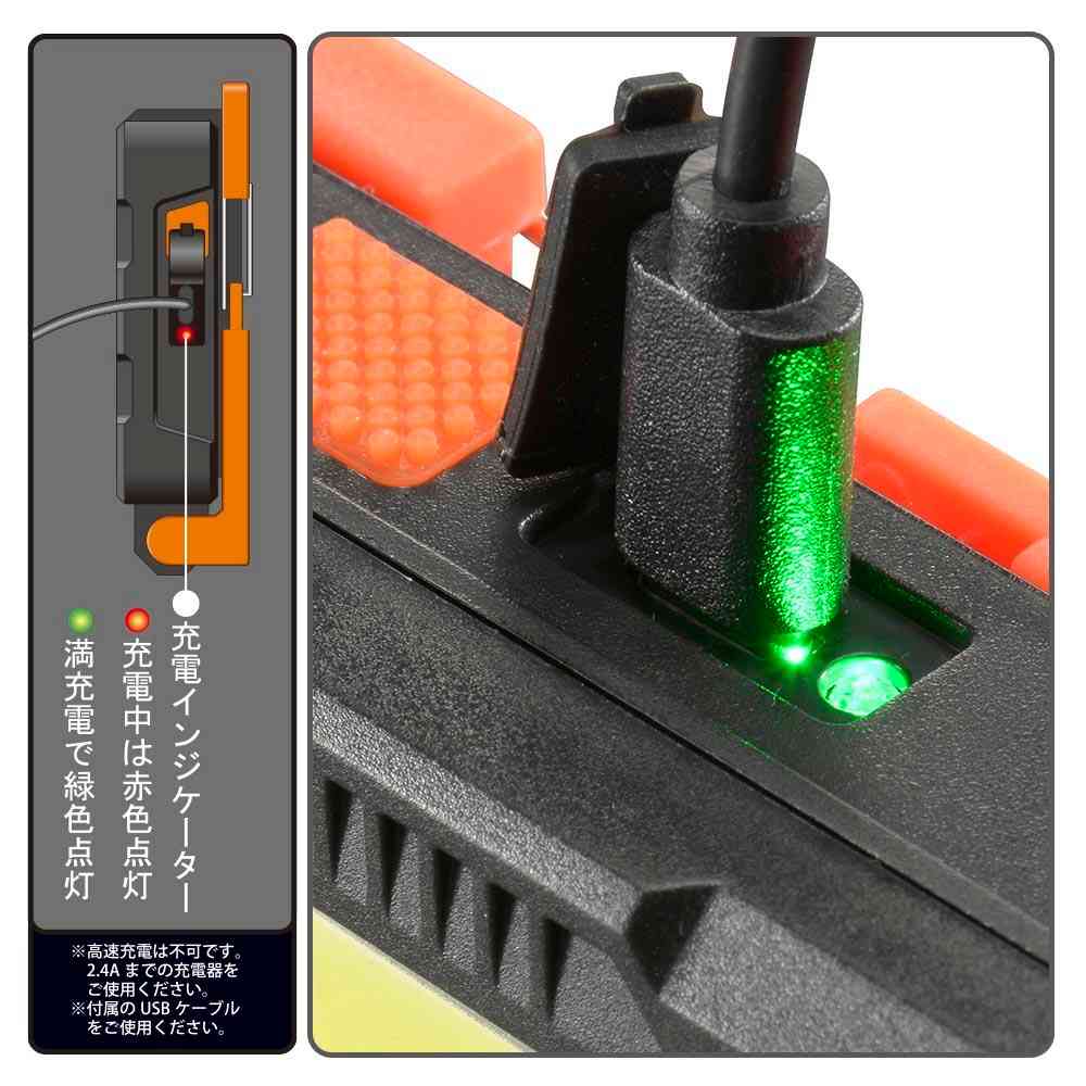 ● USB充電式、充電インジケーター付き ● カラビナ、マグネット開閉スタンド付き ● マグネット付のスタンドで金属面に固定して照射角度を調整 ● カラビナで吊り下げ ● 調光3モード(COB HIGH/COB LOW/LED) ● COBライトで広く明るく、LEDライトで遠くまで明るく ● COB HIGHモード 400ルーメン ● 連続使用時間 約3.5(HIGH)~約8時間(LED) ● USBケーブル付属、リチウムイオン電池内蔵