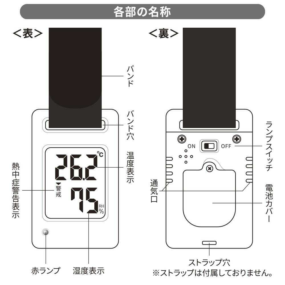 ● 熱中症予防指針を4段階(危険/厳重警戒/警戒/注意)で表示 ● 「危険」「厳重警戒」になると赤ランプ点滅でお知らせ ● バンド、動作確認用テスト電池付き ● ベビーカーに、ガーデニングに、ハイキングに