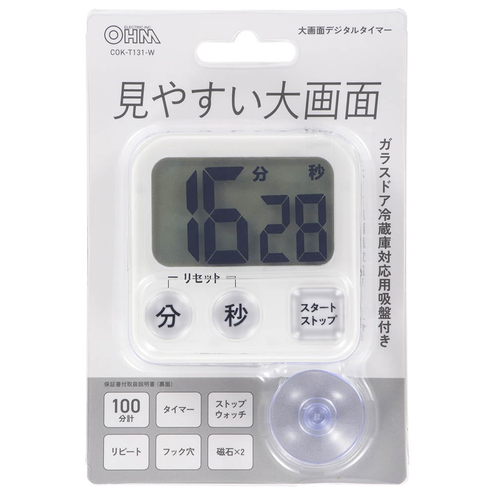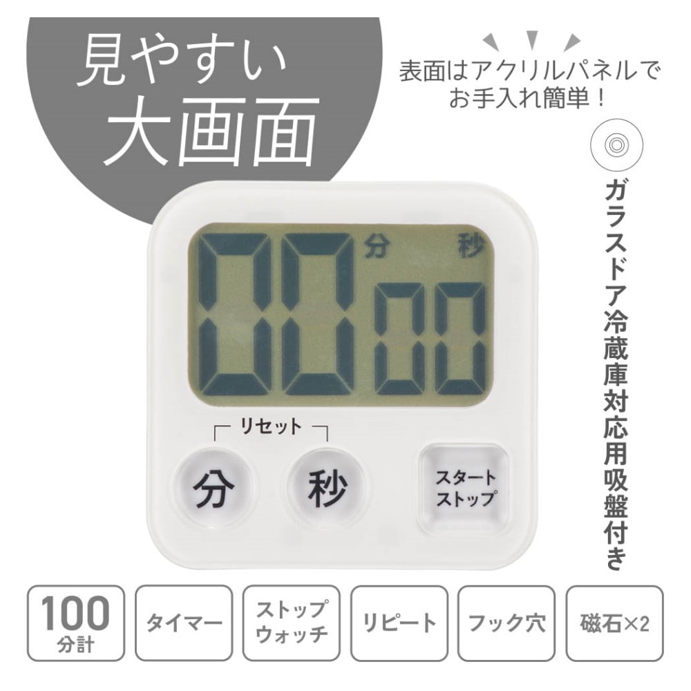 見やすい大画面、100分計、タイマー、ストップウォッチ機能、リピート機能、フック穴付き、裏面に磁石2個付き、ガラスドア冷蔵庫対応用吸盤付き、ホワイト