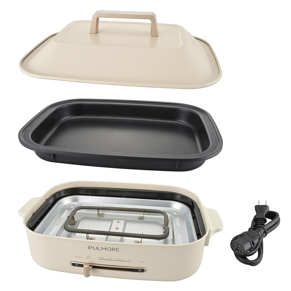 ● コンパクトサイズで使いやすい ● 無段階(80~230度)の温度調節レバー付き ● プレートが外せてお手入れしやすい ● 着脱式電源コードで収納もお手入れも簡単 ● 本体一体式ヒーター ● フッ素樹脂加工プレート ● 手軽でおいしいを食卓に、いろいろな料理にチャレンジできる