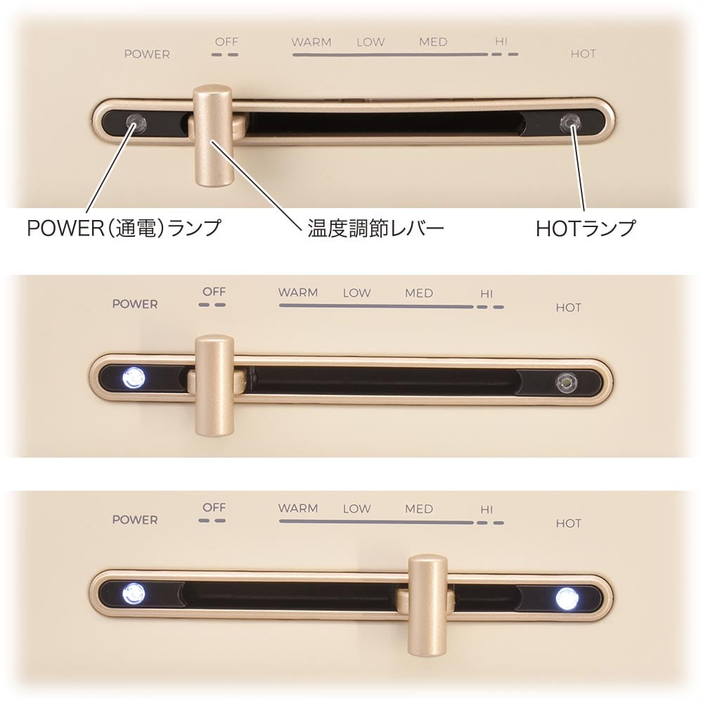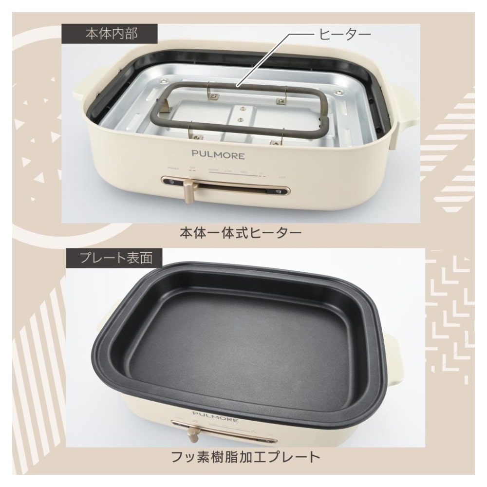 コンパクトサイズ、使いやすい、無段階、80~230度、温度調節レバー付き、プレートが外せて、お手入れしやすい、着脱式電源コード、収納もお手入れも簡単、本体一体式ヒーター、フッ素樹脂加工プレート、手軽でおいしいを食卓に、いろいろな料理にチャレンジできる