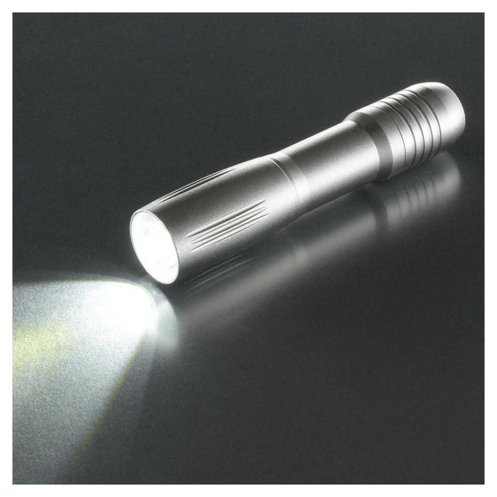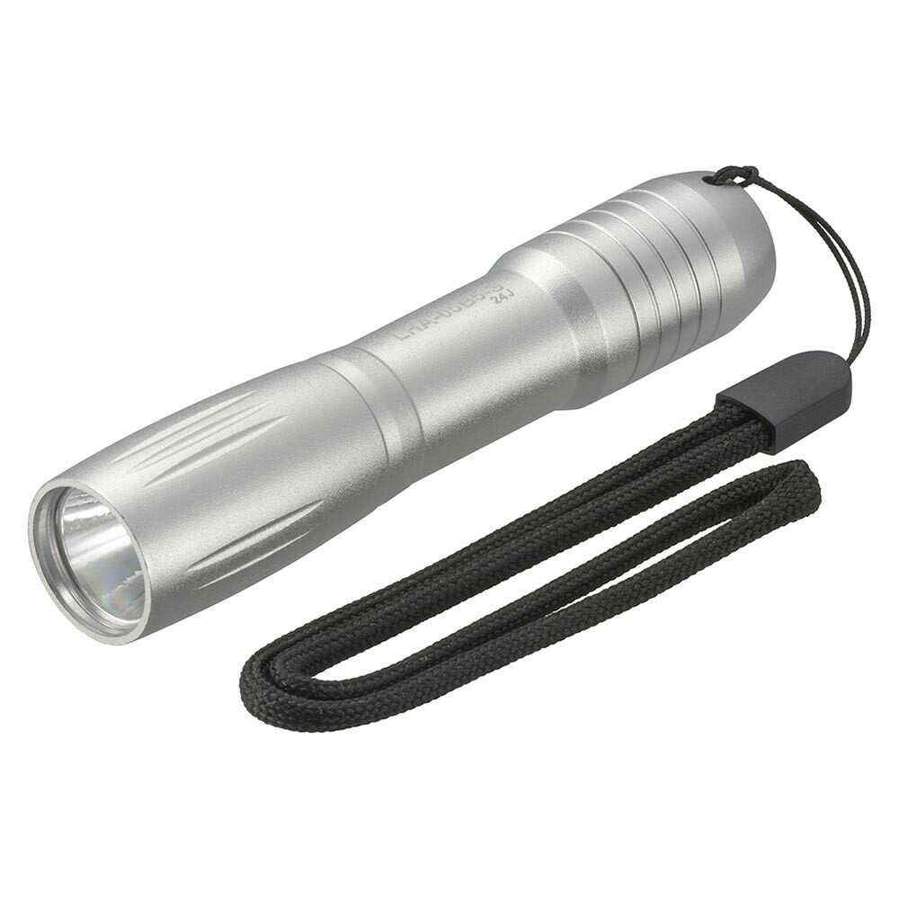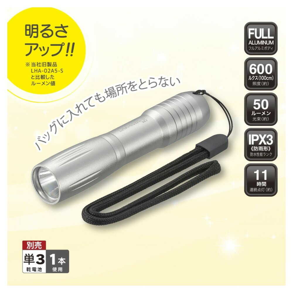 コンパクトサイズ、LEDライト、フルアルミボディ、約50ルーメン、防水保護等級IPX3、防雨形、シルバー