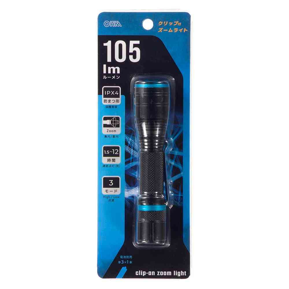 ● 105 lm ● 保護等級:IPX4 防まつ形 ● Zoom 集光/散光 ● 連続点灯(約):1.5~12時間 ● 3モード:High/Low 点滅