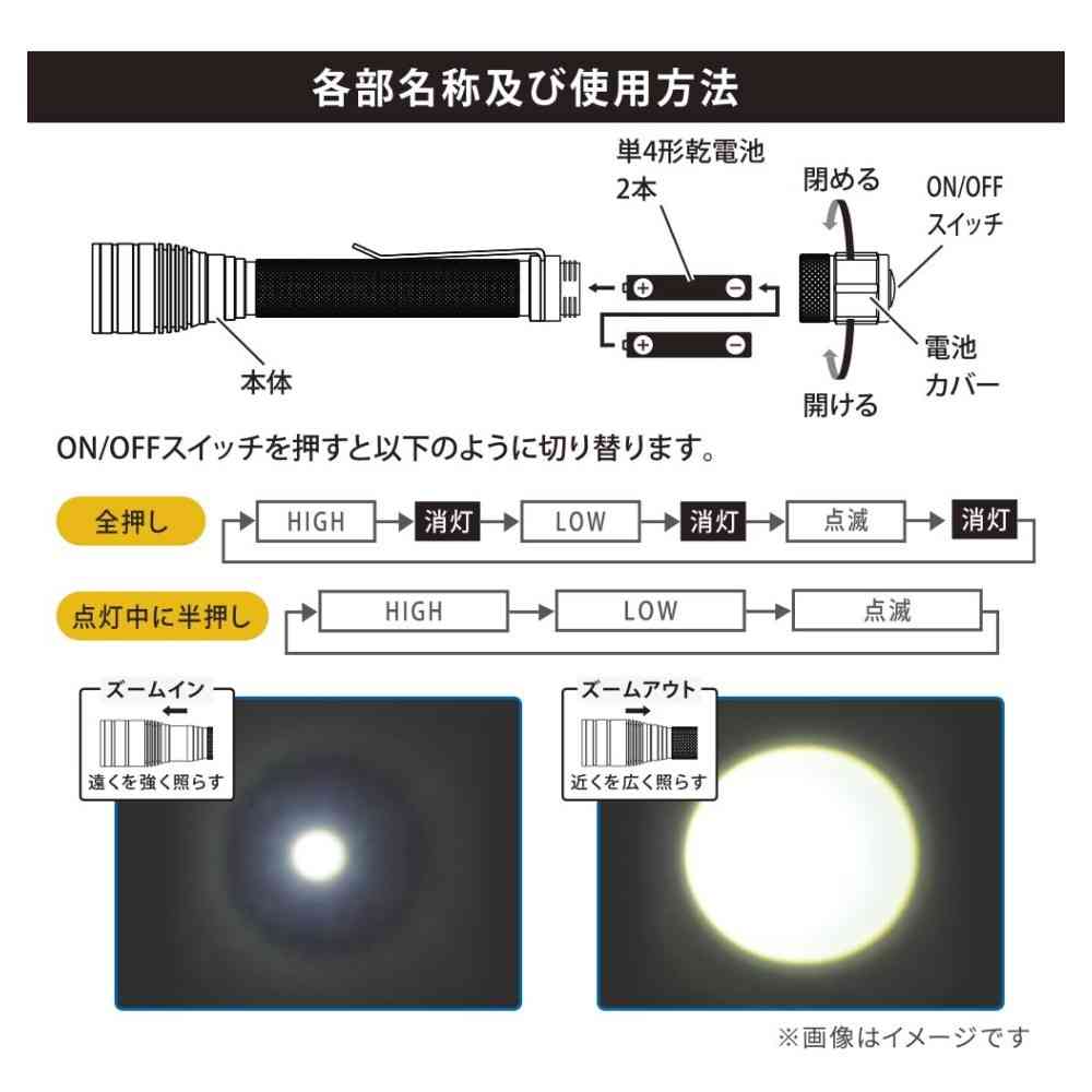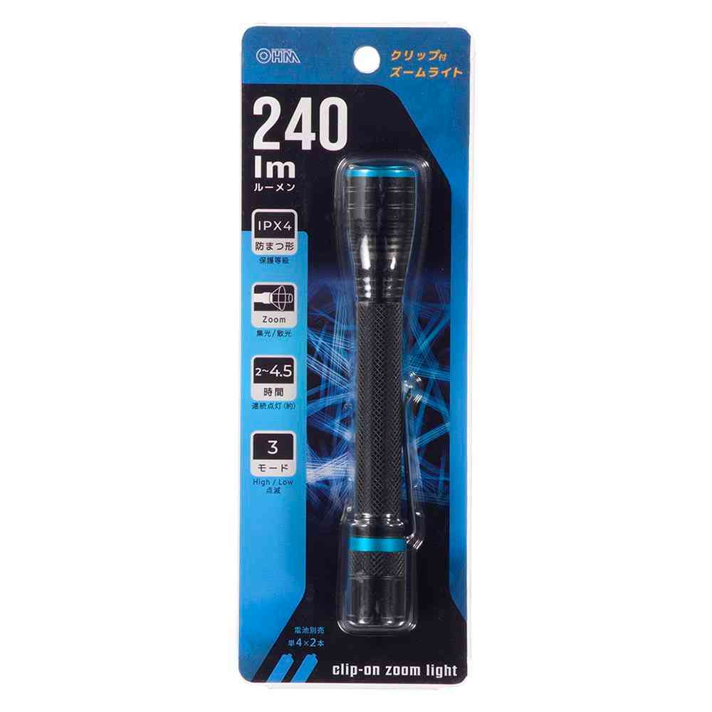 240 lm、保護等級、IPX4 防まつ形、Zoom、集光、散光、連続点灯2~4.5時間、3モードHigh/Low点滅