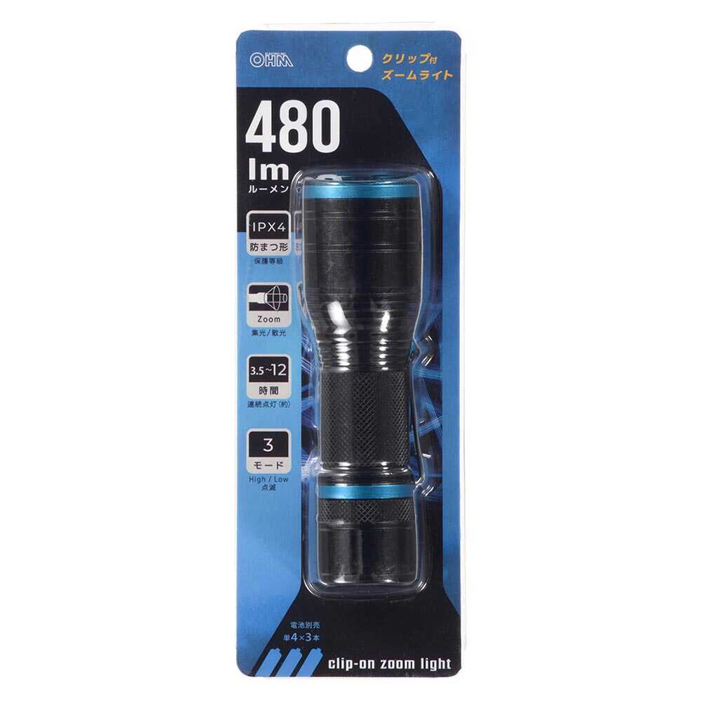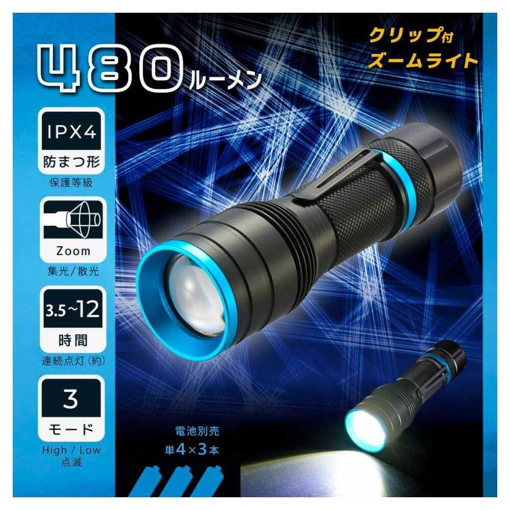 480 lm、IPX4、防まつ形、Zoom、集光/散光、連続点灯、3モード、High/Low、滅